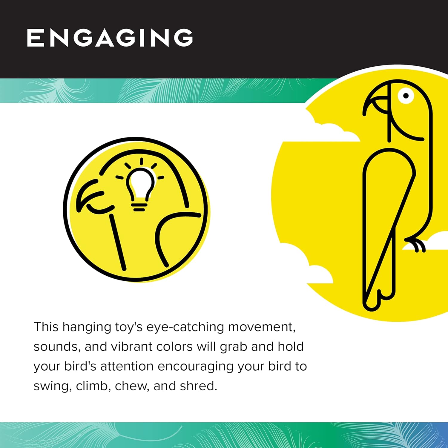 - ENGAGING AND INTERACTIVE: Bright, multi-colored wooden blocks on this hanging toy will keep your bird's attention for hours! The eye-catching movement, sounds, and vibrant colors of these parrot toys for large birds will foster interactive play and encourage your bird to swing, climb, chew, and shred