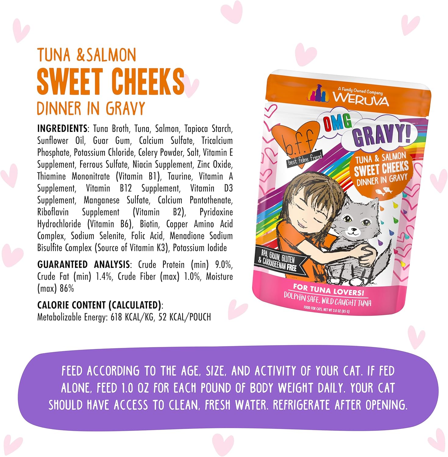Weruva B.F.F. OMG - Best Feline Friend Oh My Gravy!, Tuna & Salmon Sweet Cheeks with Tuna & Salmon in Gravy Cat Food, 3oz Pouch (Pack of 12)