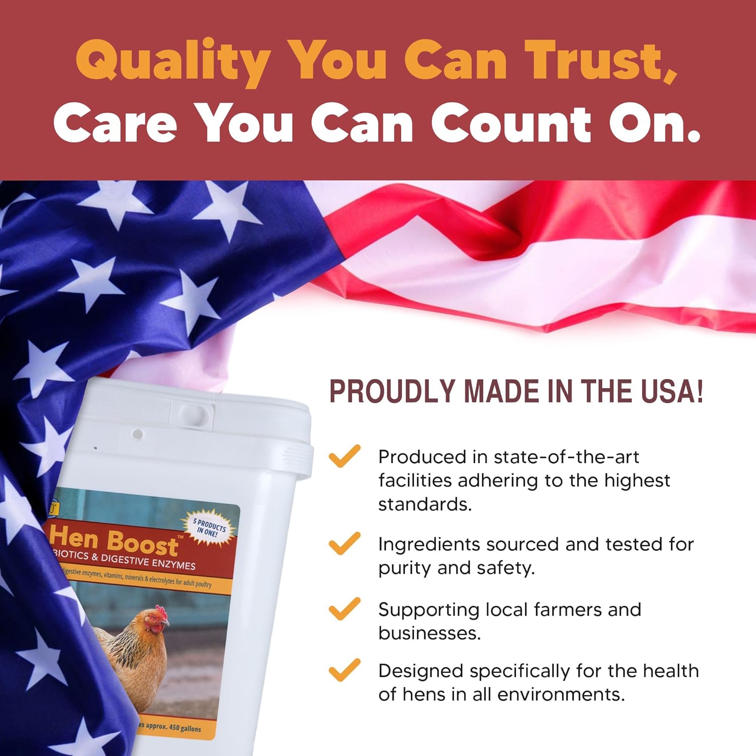 - Digestion Supplement - The benefits include immune system stimulation, improved feed intake, digestion and hydration. Providing access to Hen Boost in clean water during stressful times helps your birds recover and maintain their health with ease.