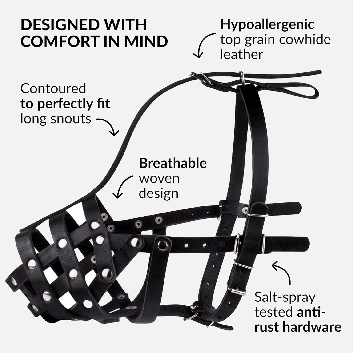 - COMFORTABLE: Our high-quality, handmade leather dog muzzle is skin-friendly. With a cross-weave design, this breathable, durable muzzle is soft on your dogβs fur because your petβs comfort always comes first.