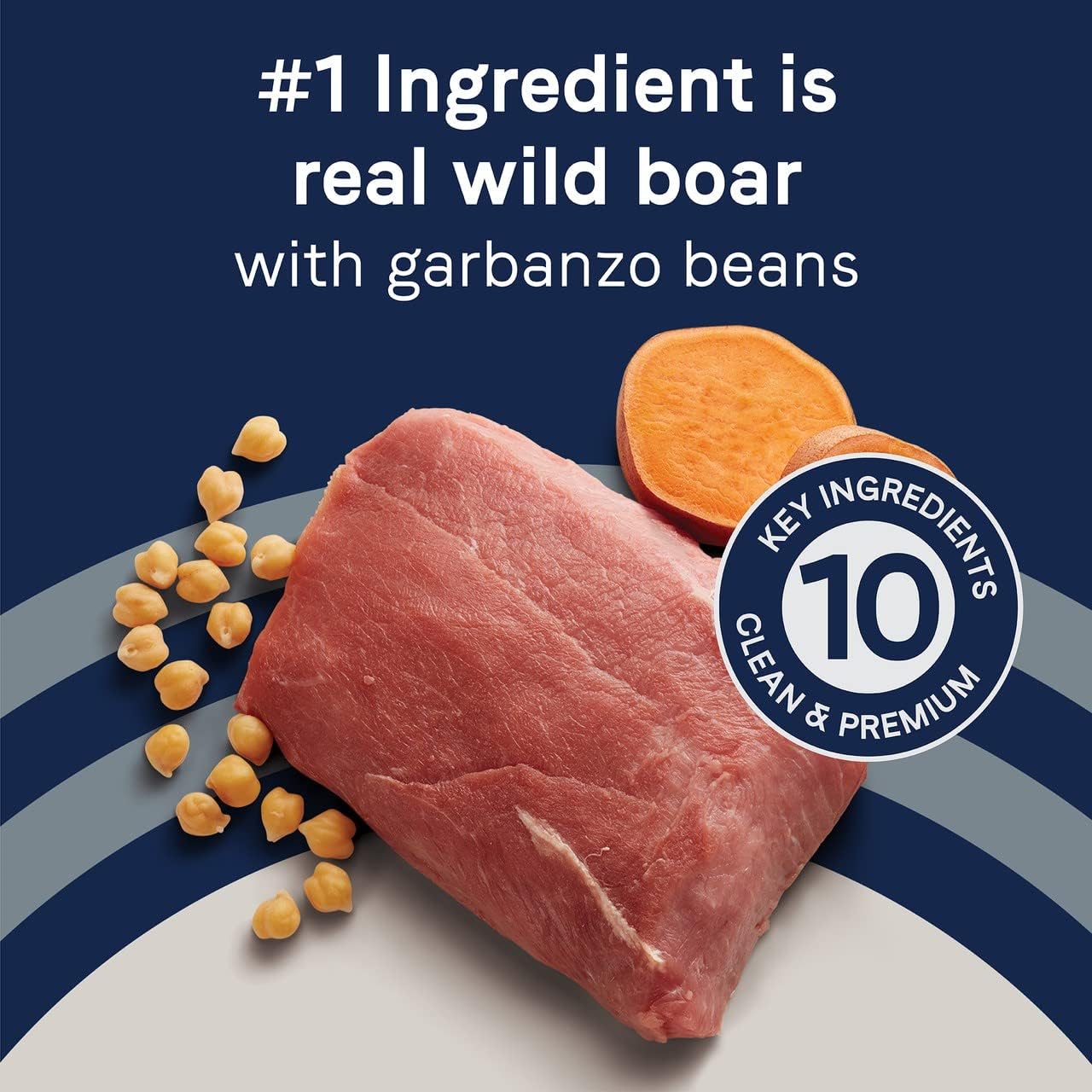 - Real food ingredients for the taste your dog will love. Crafted with real wild boar as the first ingredient, paired with whole ingredients like garbanzo beans, peas and sweet potatoes