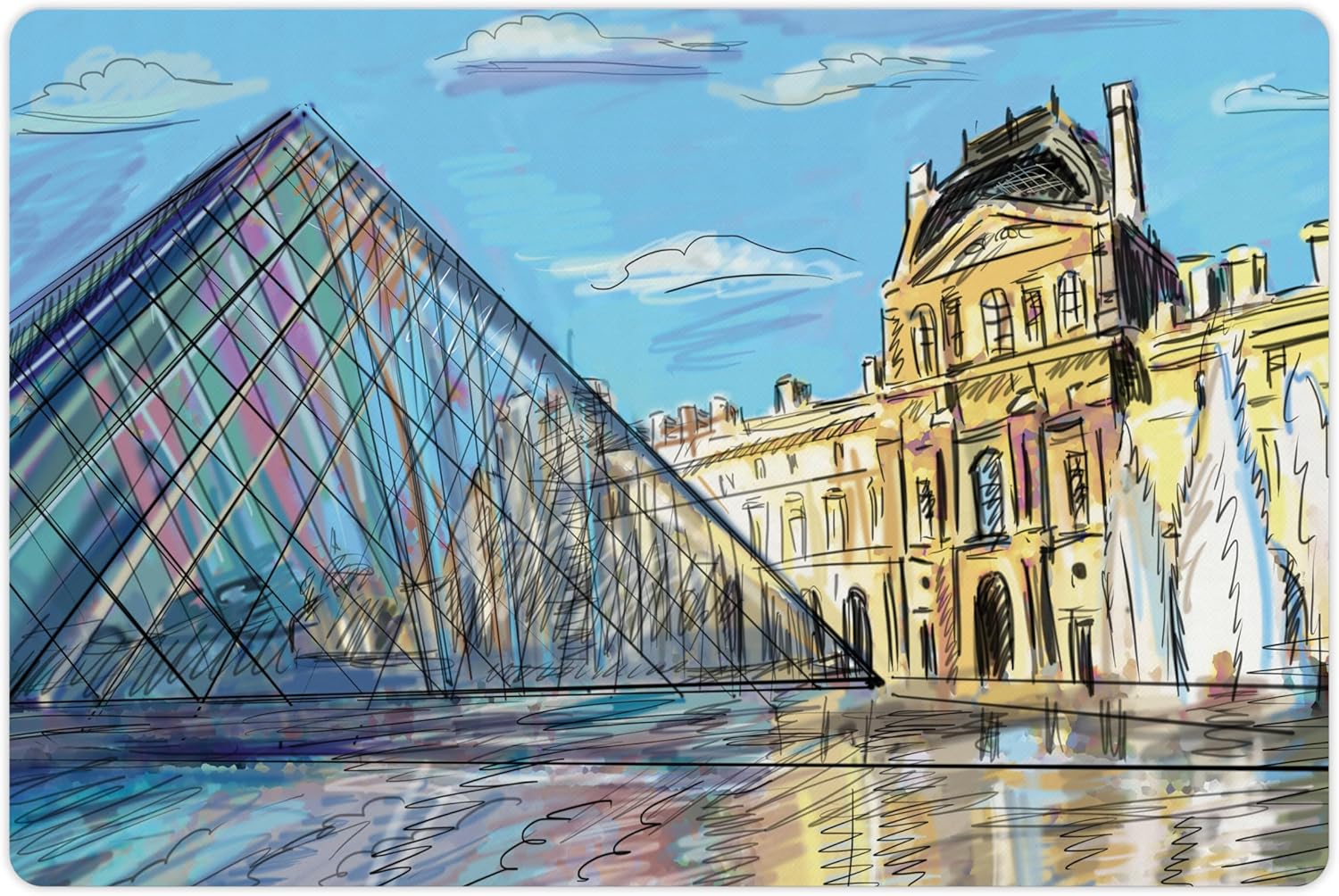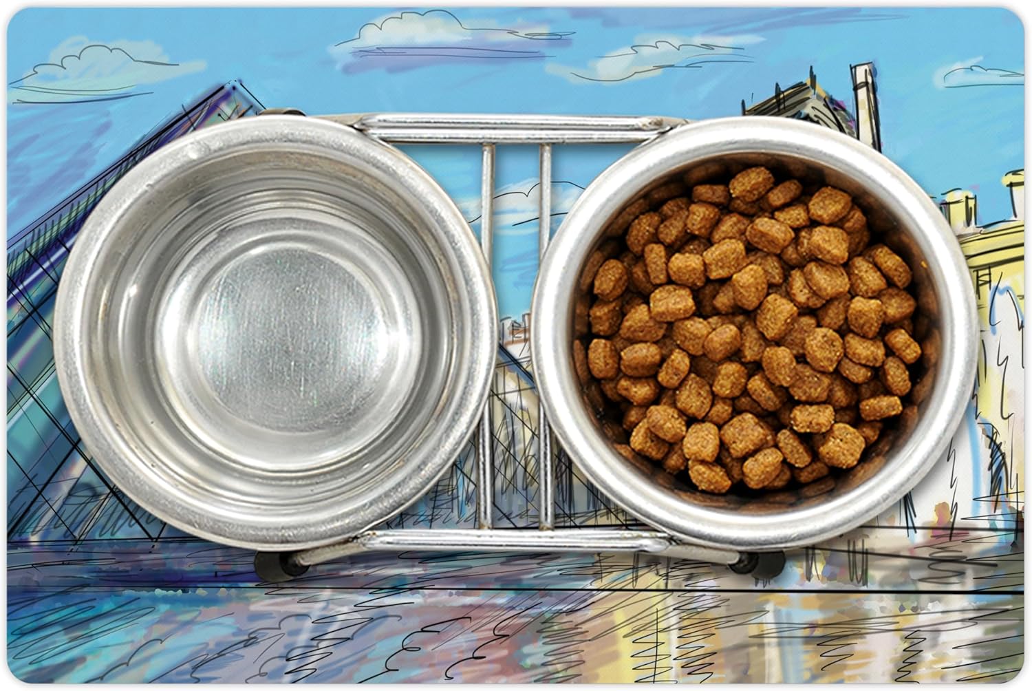 Lunarable Sketchy Pet Mat for Food and Water, Museum Themed Paris Watercolor Modern French Place Pop Art Style Day Time Image, Non-Slip Rubber Mat for Dogs and Cats, 18" X 12", Cream and Blue