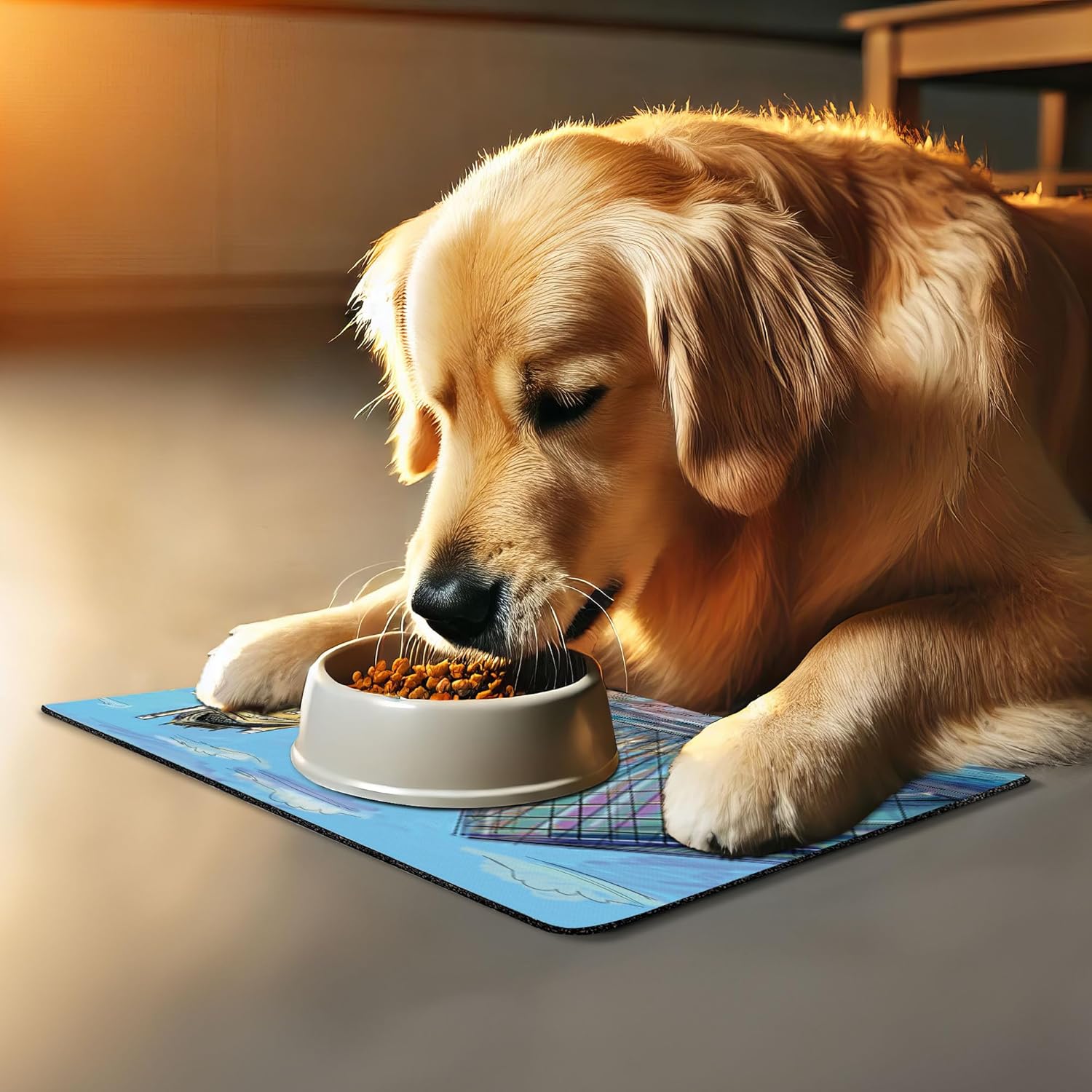 - Features - Fun prints and long-lasting colors. Find any theme and color you want to match your room decor or your petβs personality. This pet feeding mat can even feature your cat's or dogβs favorite item or design, adding a cheerful touch to your petβs feeding area.
