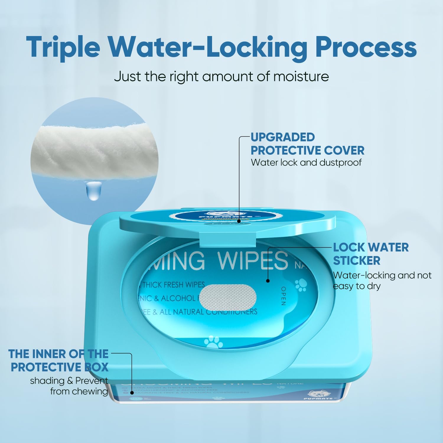- CONVENIENT STORAGE AND DISTINCTIVE BOX DESIGN: The PUPMATE experience is about convenience, and our pet wipes exemplify this principle. Encased in a moisture-sealed box that shields them from dust and light, they're primed for use at a moment's notice. Be it your adventures outdoors or cozy moments at home, our dog wet wipes take on the role of unwavering protectors, an indispensable resource for your pet's joy
