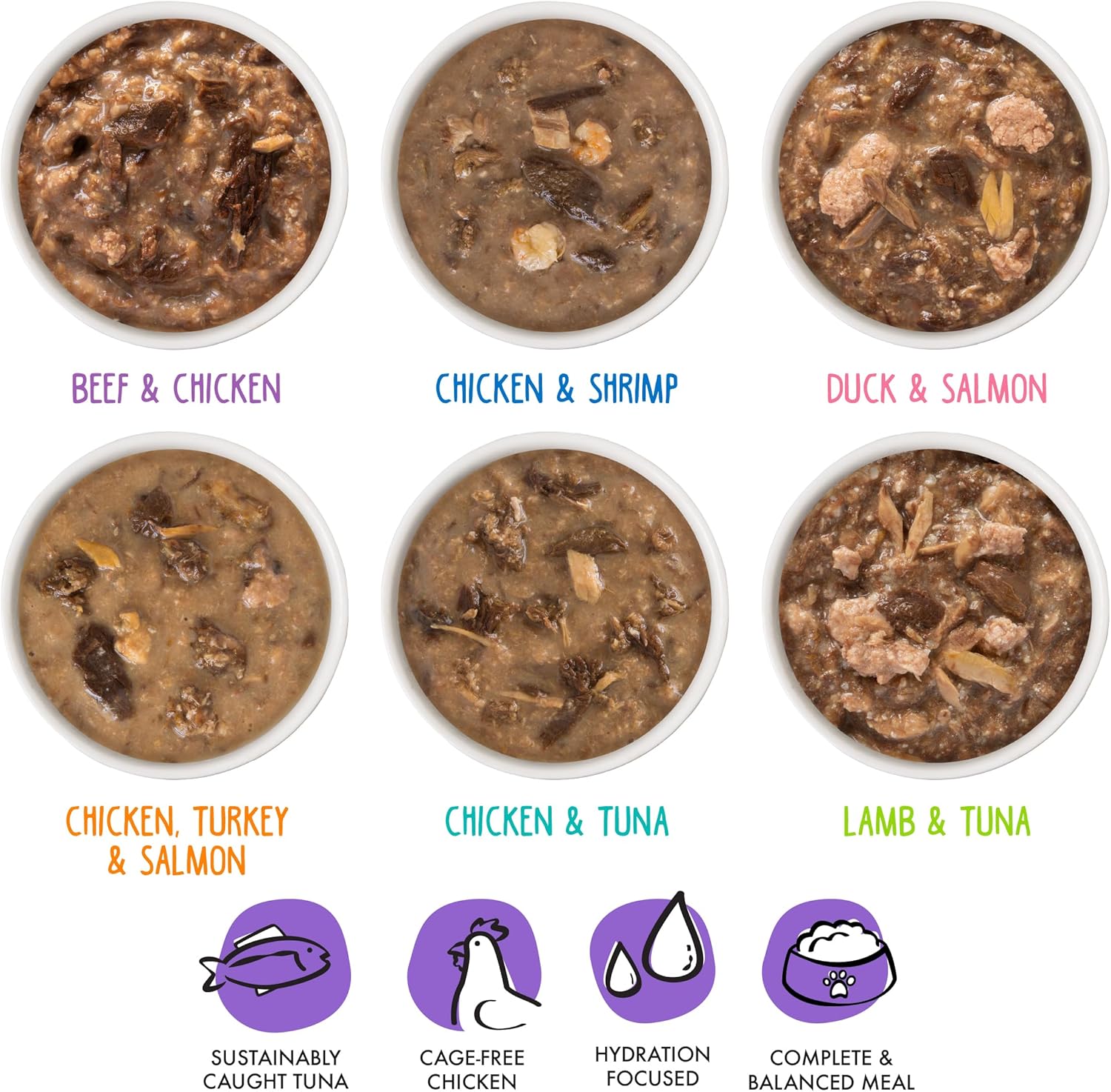 - Potluck O' Pouches Variety Pack (2.8oz Pouches, Pack of 12) OMG, Six different flavors in one variety pack! Featuring premium proteins like tuna, chicken, salmon, beef, lamb and duck in a tasty gravy.