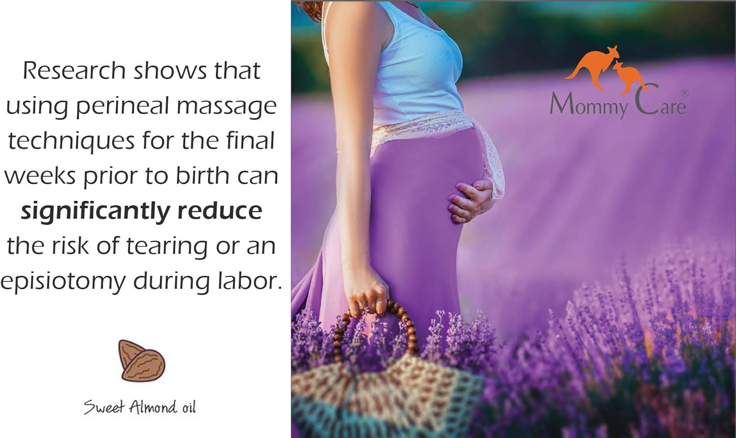- Almond Oil - Mommy Careβs all natural sweet almond oil is ideal for perineal massage due to its slow absorbent to the skin without a greasy feel, allowing for a more extended lubrication period.