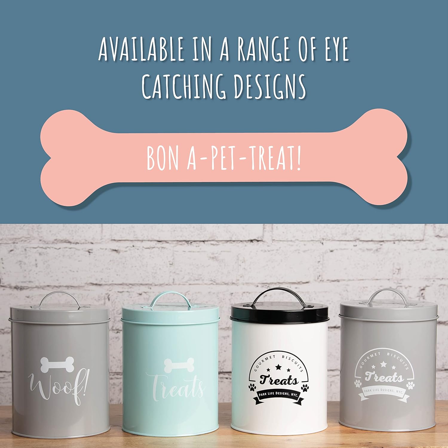 Park Life Designs - Metal Pet Treat Jar with Airtight Lid for Dogs, Cats, Puppies and More, Chic Kitchen Countertop Container for Cookies, Biscuits and Treats (Gourmet Biscuits, Grey, 1.4 Qt)