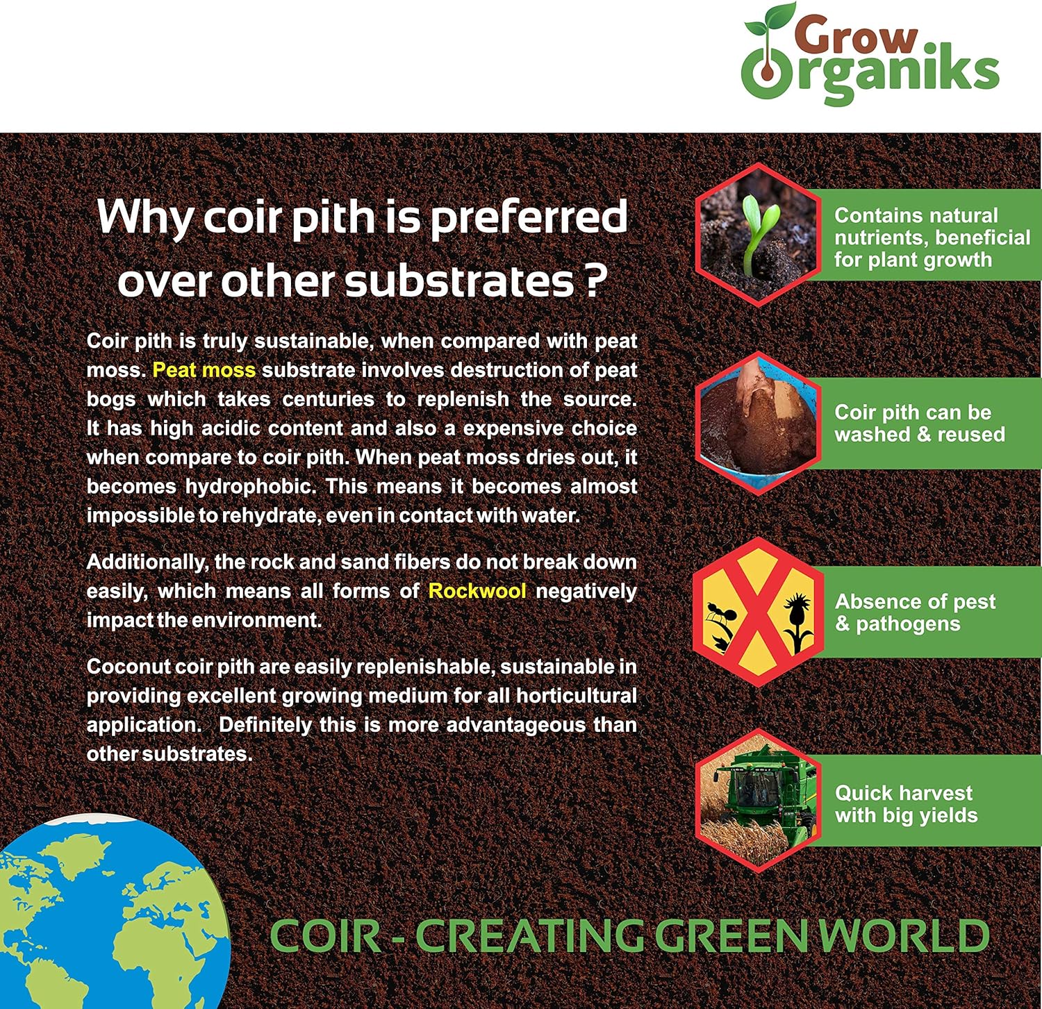 - [🌱AT GROW ORGANIKS] We supply odorless, pathogen free coco coir brick of consistent quality created from most sustainable and eco friendly manufacturing methods.Coir pith is thoroughly washed with fresh water and quality check is enforced for low EC and neutral pH range.