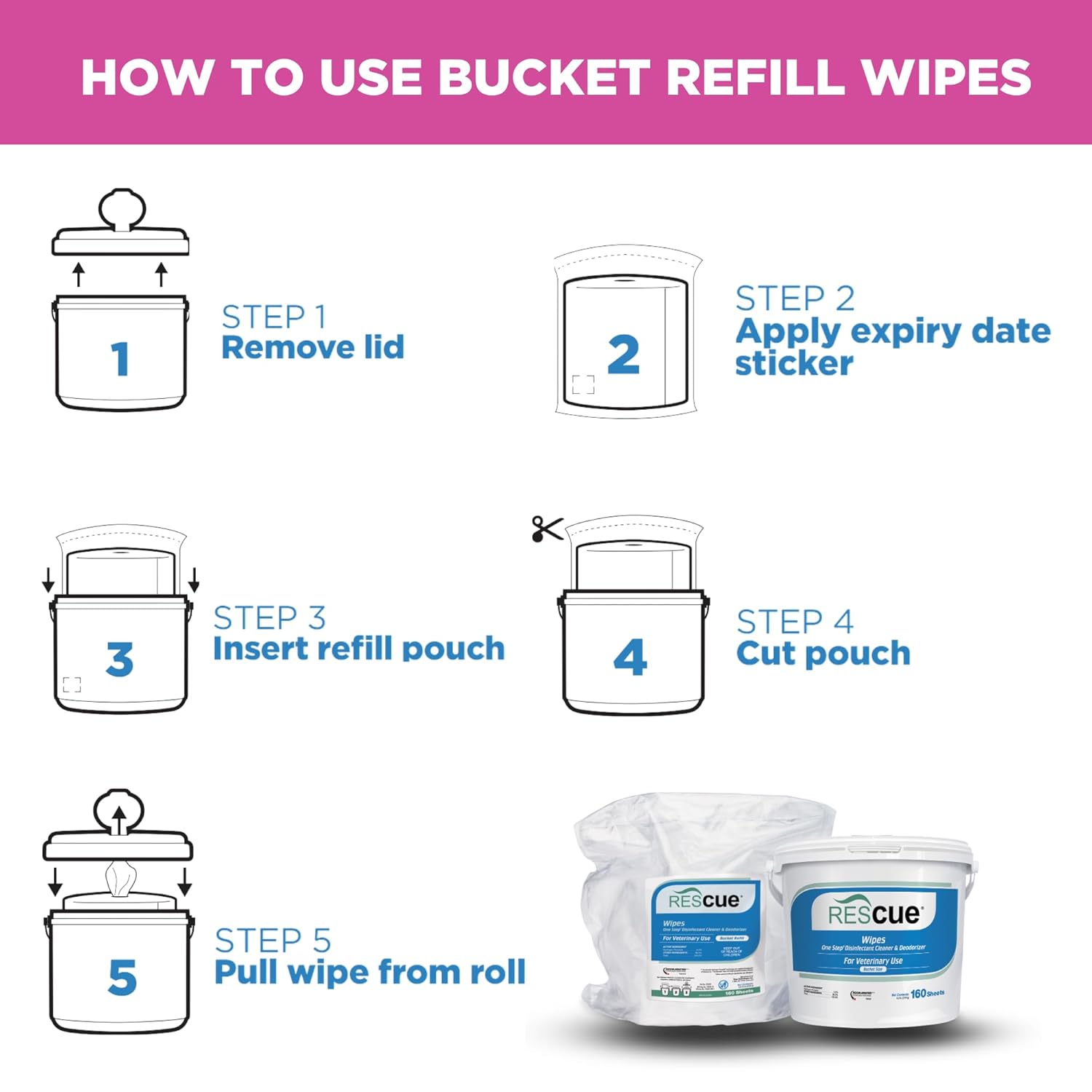 REScue One-Step Disinfectant Cleaner & Deodorizer Wipes for Vet Use – Cleaner for Kennels, Litter Boxes, Vet Offices, Pet Grooming Surfaces – Extra Large Wipes, 160-Count Bucket Refill (1 Pack)