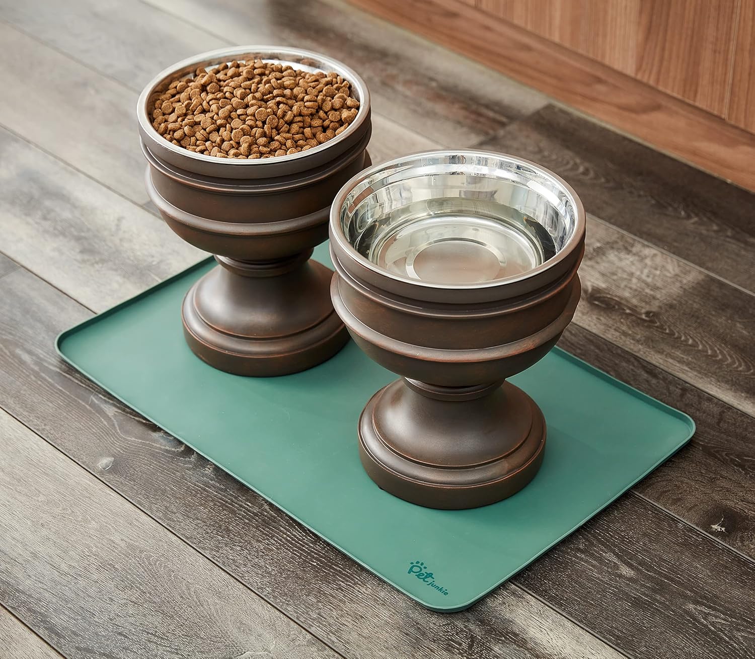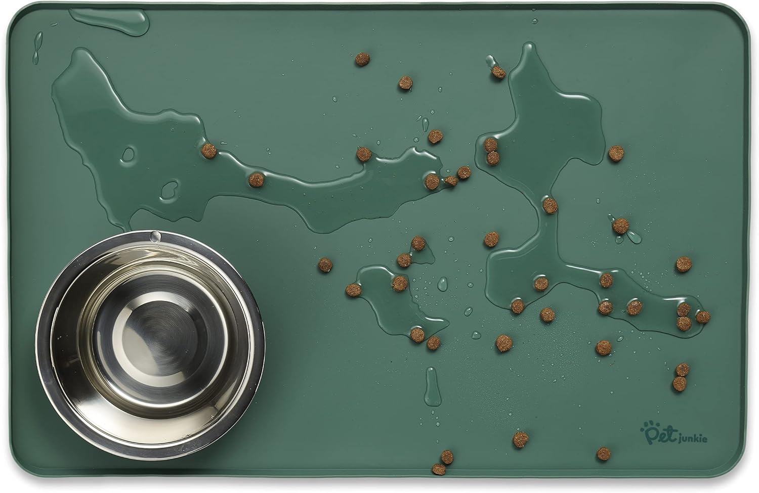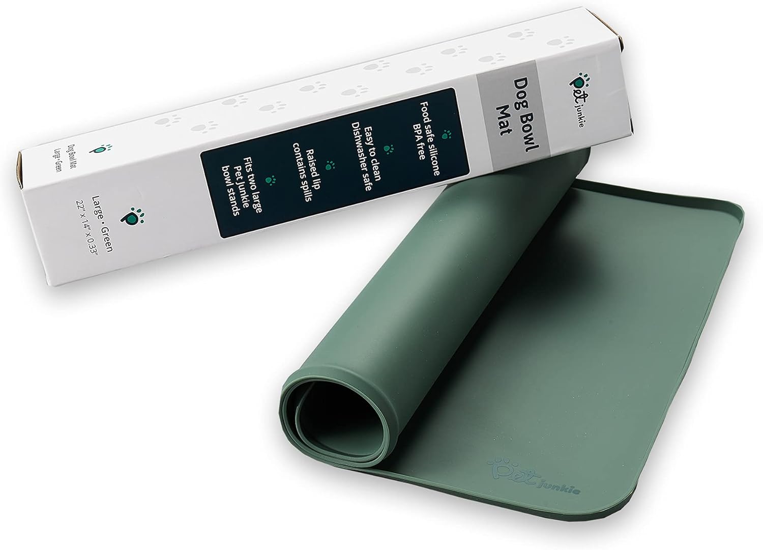 - LARGE AND SMALL PETS: 22" x 14" x 0.33" - This dog food placemat fits two Pet Junkie bowl stands or comparably sized pet dishes. Perfect size for a food mat for dogs or a cat feeding mat.