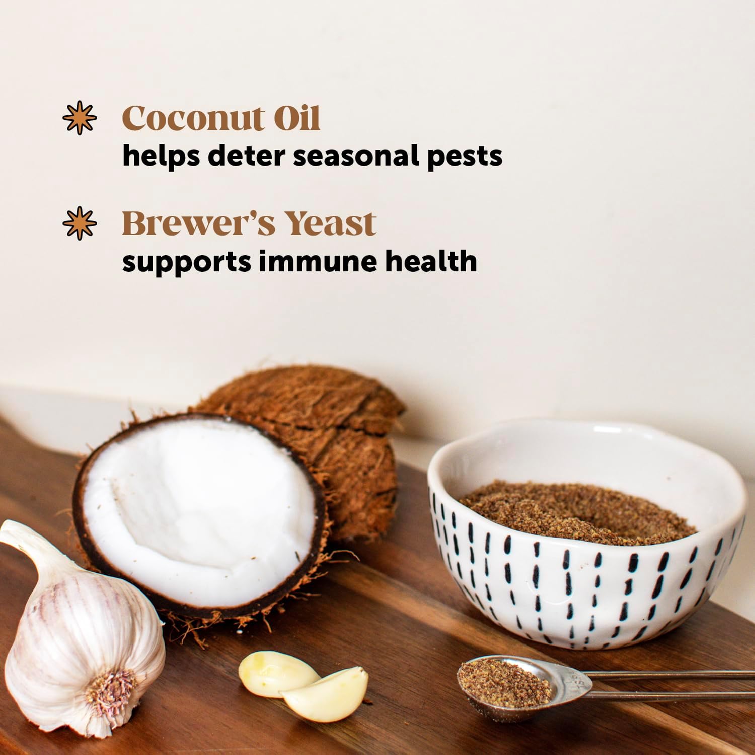 - THE GREATER OUTDOORS - Because of whatβs inside our flea & tick chewables, your pupβs gonna love going outside even more. We make our natural flea and tick chews with wholesome ingredients like coconut oil that contains fatty acids to help deter seasonal critters, brewerβs yeast to support immune system health, & garlic, to help keep fleas, ticks & other unwanted creepy crawlies at bay. This isnβt just flea & tick prevention, itβs a healthier way to provide resistance to pests.
