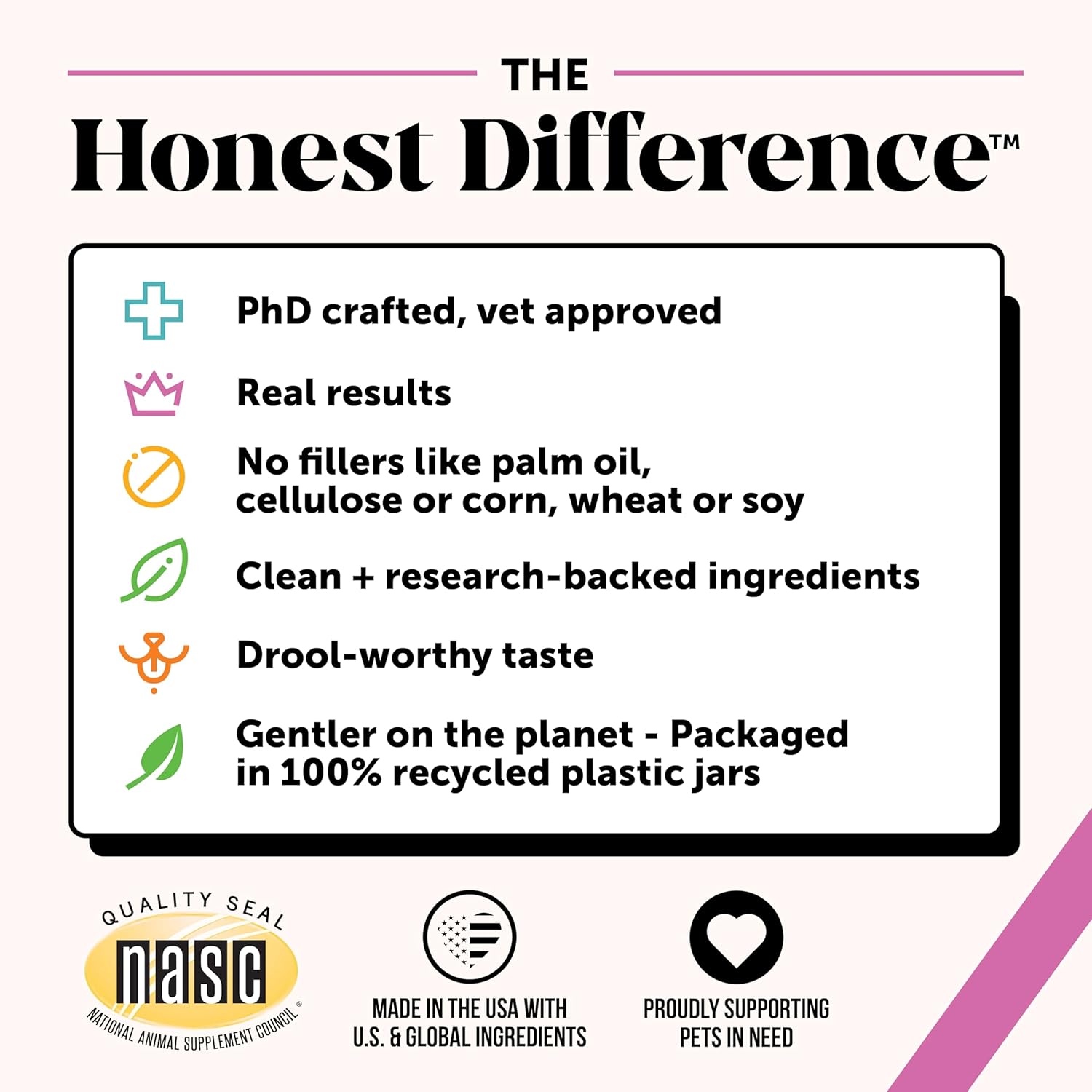 - Pet Honesty pledge: A taste your pet will love and results you can trust. Made with the most effective natural and other premium ingredients. Formulated without corn, wheat, or soy. No artificial preservatives, colors, or flavors.