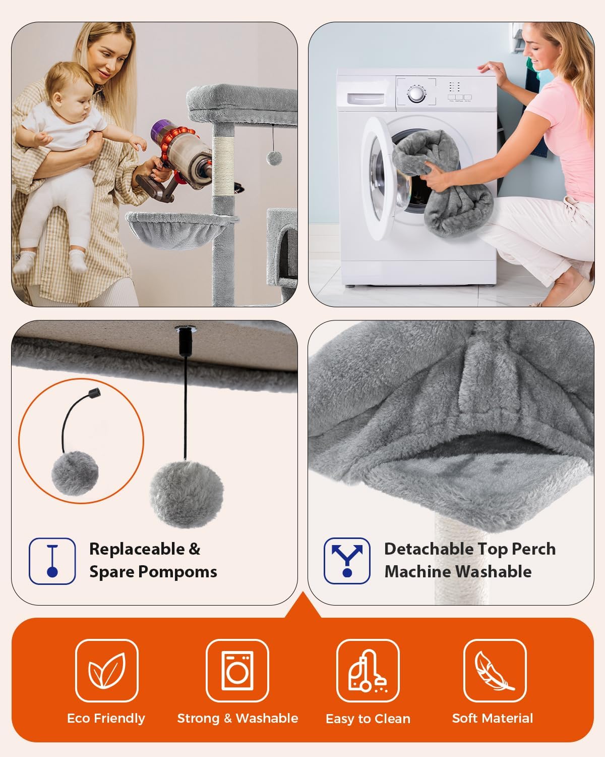 - Reliable Quality: Stability and safety are always the key points. Crafted by soft plush fabric, CARB-certified natural particle boards, firm sisal wrapped posts and strengthened base, itβs sturdy and safe for fat and heavy cats to bounce and enjoy up on their castle with ease
