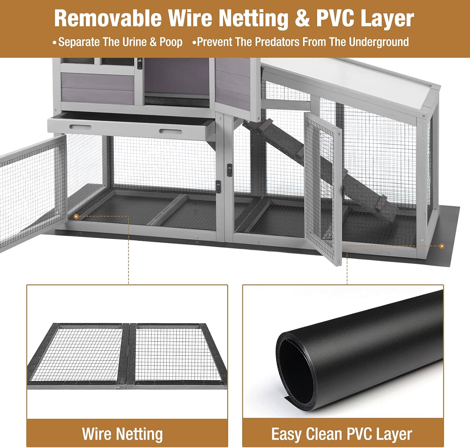 - PVC Layer: The PVC layer prevents urine from leaking out of the floor. Easy for you to clean the bunny hutch, and prevents predators from the ground
