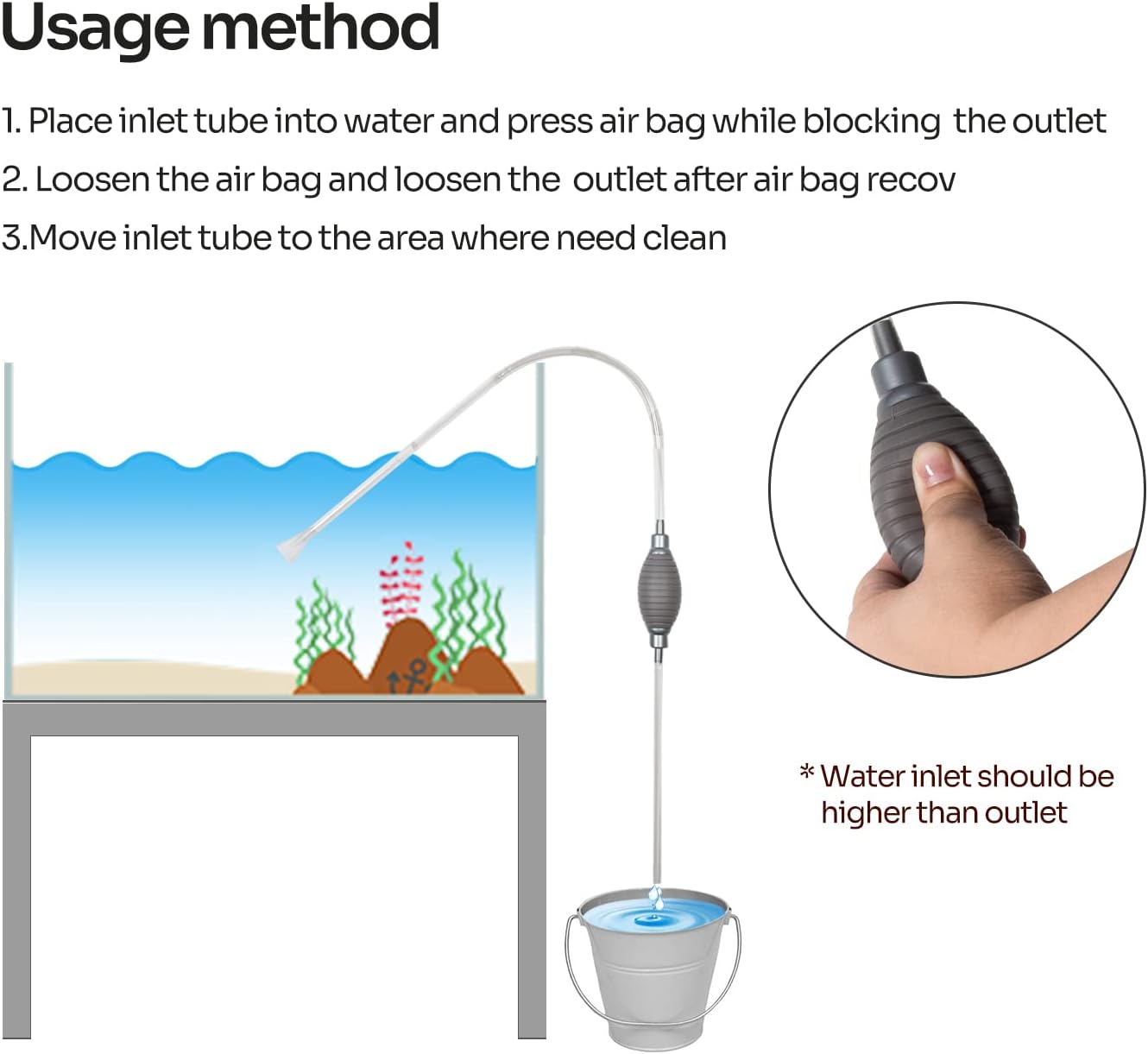 - γ2 IN 1 Multifunctional Siphon Gravel Cleaner Setγ: It can work as water changer or tank cleaner as it has grid inlet head and oblate head, you can install the head as you need. Whether you have a small or extra-large tank, this flexible terrarium cleaning kit works well with all types of terrarium, the tube is long enough(79inch) and flexible, convenient to use.