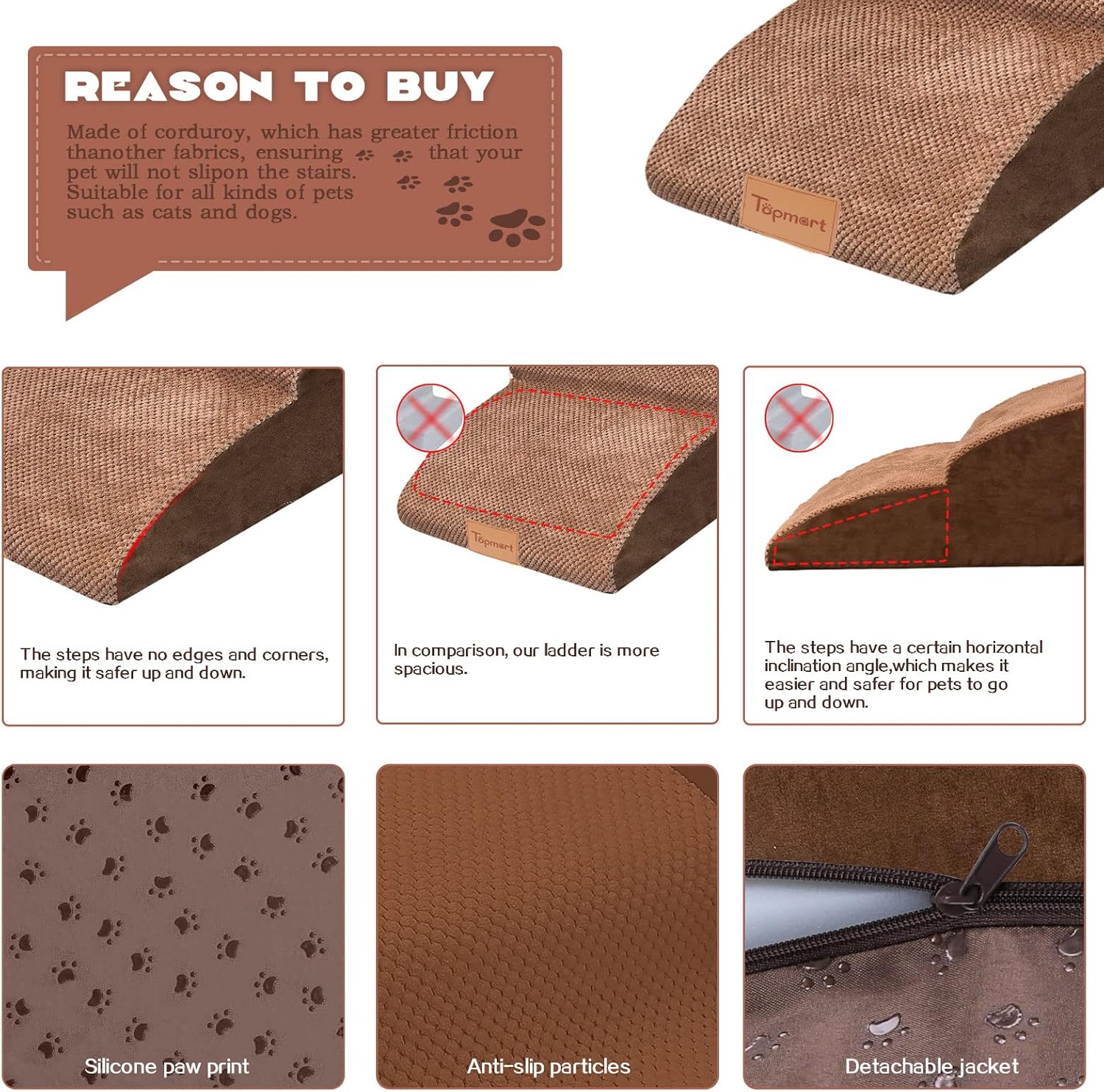 - Safer,Wider&Deeper Steps: Our dog stairs are excellent for those older dogs who are less mobile as they age or for cats with injuries. More wide and deep steps are helpful for reducing the strain that constantly jumping up and down onto lower bed,sofa can have on your pet's joints,and topmart dog steps will not shake and slip during use. The cover made of corduroy is more frictional than other covers, pets will not slip on the stairs.