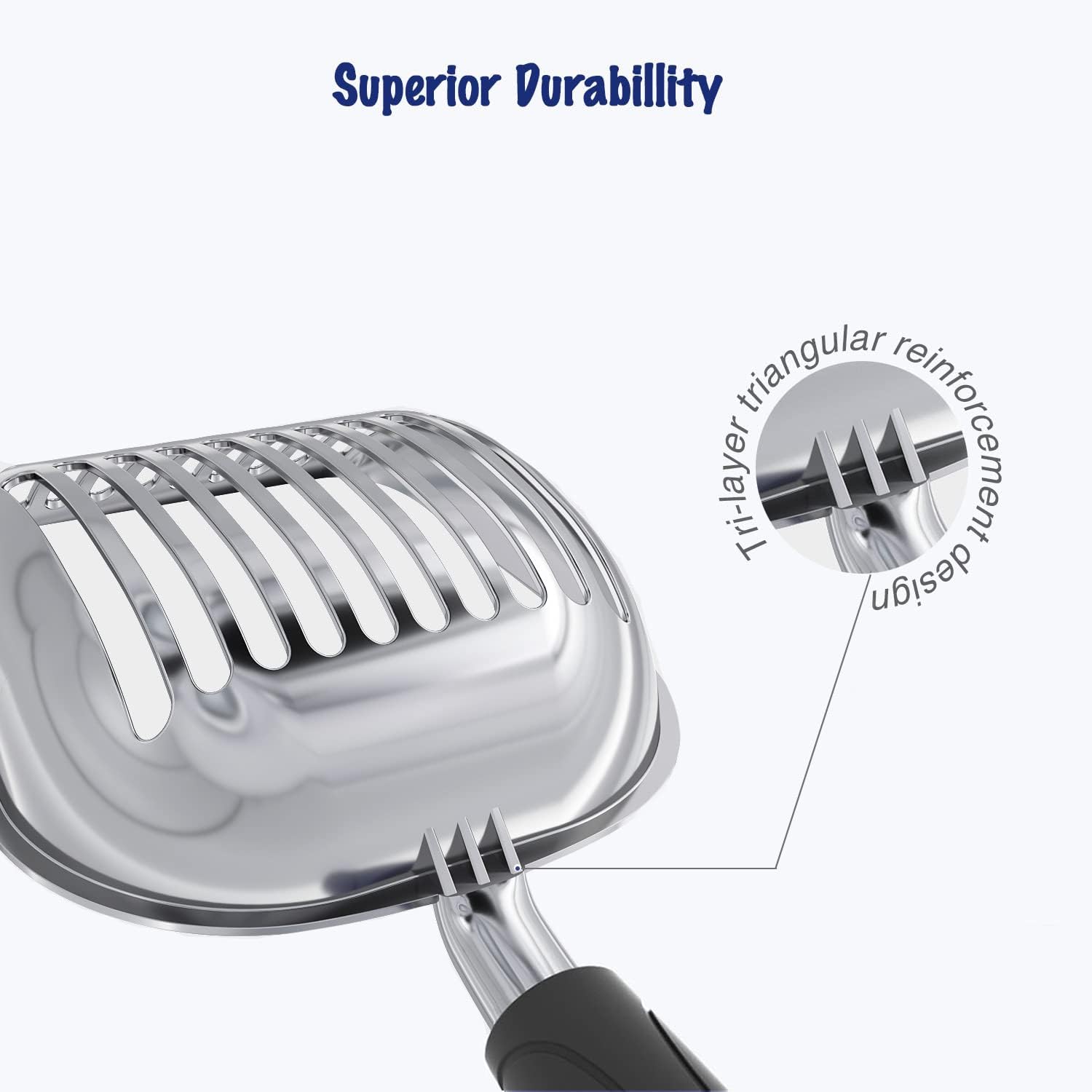- [Features]: WePet made this scooper durable with heavy duty quality. After investigation with thousands thoughtful users, we finally make an improvement of removing the serrated edge as mentioned on reviews. The body is waterproof and very easy to clean, rust-resistant and corrosion resistant. Itβs highly recommended by cat lovers for everyday use.