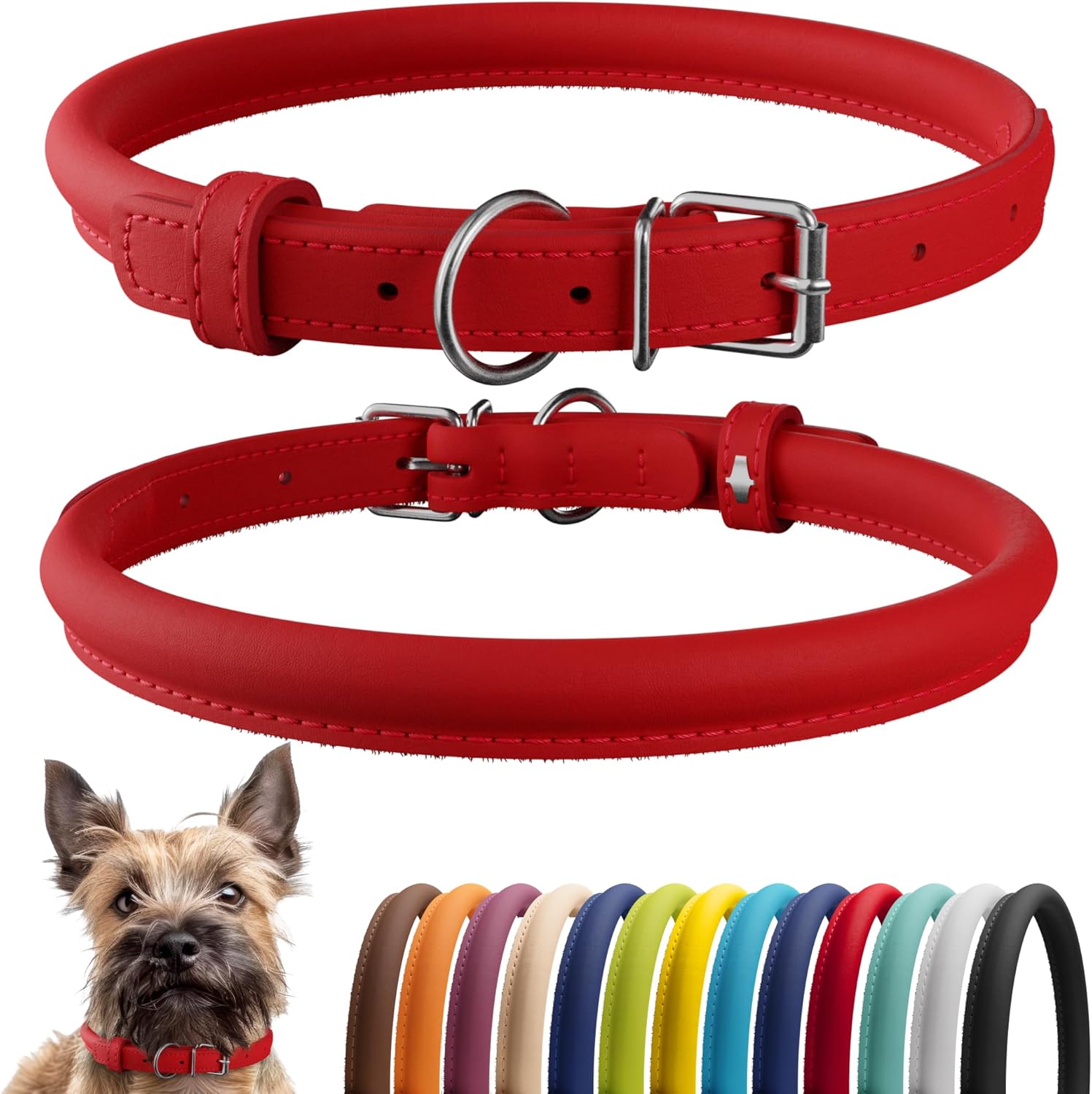 CollarDirect Rolled Leather Dog Collar, Soft Padded Round Puppy Collar, Handmade Genuine Leather Collar Dog Small Large Cat Collars 13 Colors (6 Inch, Red Smooth)