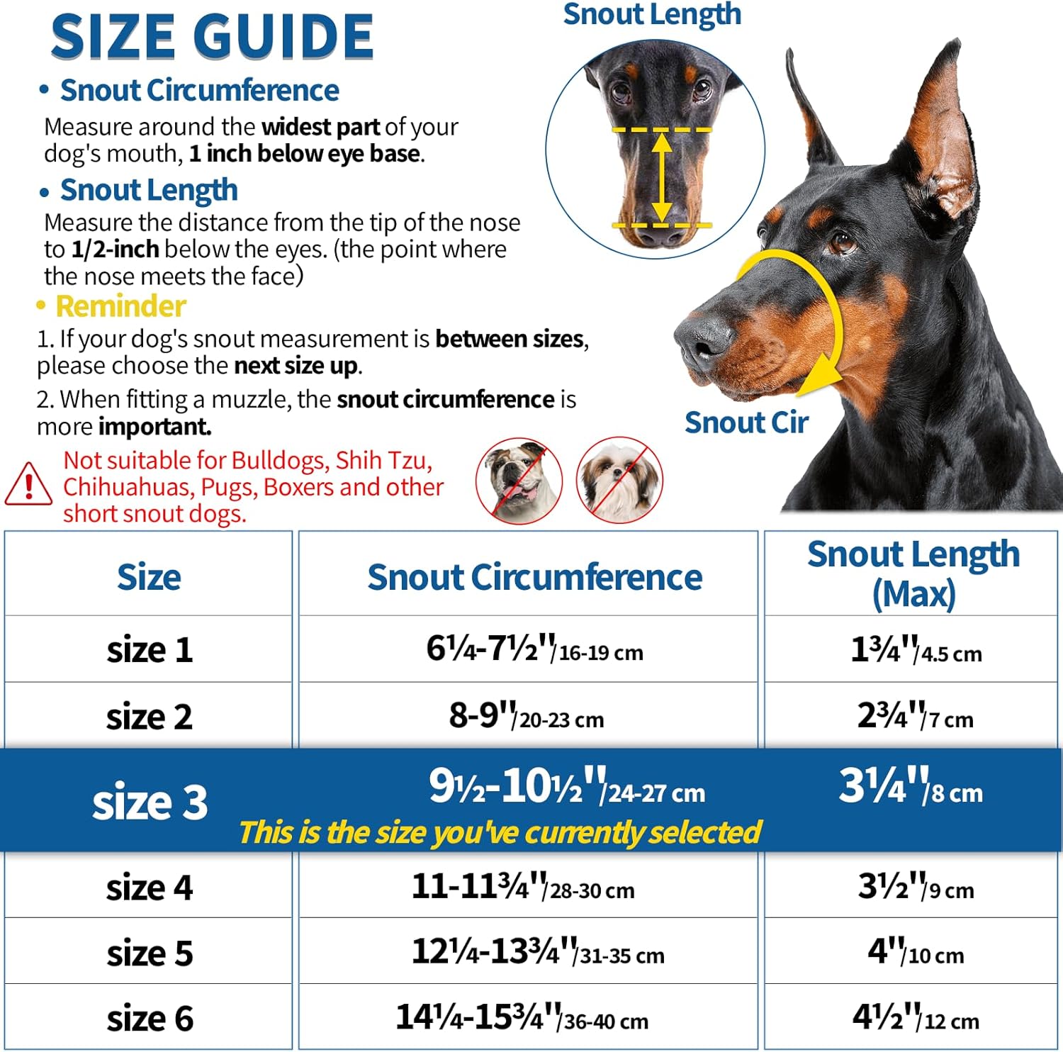 - PLEASE MEASURE BEFORE BUYING: Snout circumference and snout length must be measured both. If the circumference fit one of the sizes in the size chart, but the length is over the maximum range of this size (about 1 inch), you should choose the next size for a better fit. For long-snout dogs like Doberman, please make sure the dog's snout length fits the size