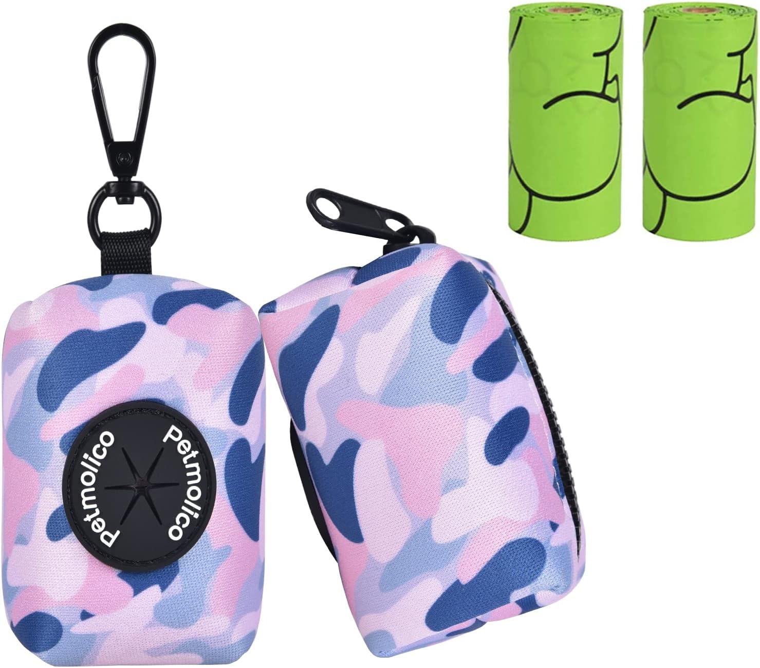Petmolico Dog Poop Bag Holder Leash Attachment, Waste Bag Dispenser Zippered Pouch, Fits Any Leash, Includes Free Roll of Bags, 2 Pack - Blue Pink Camouflage