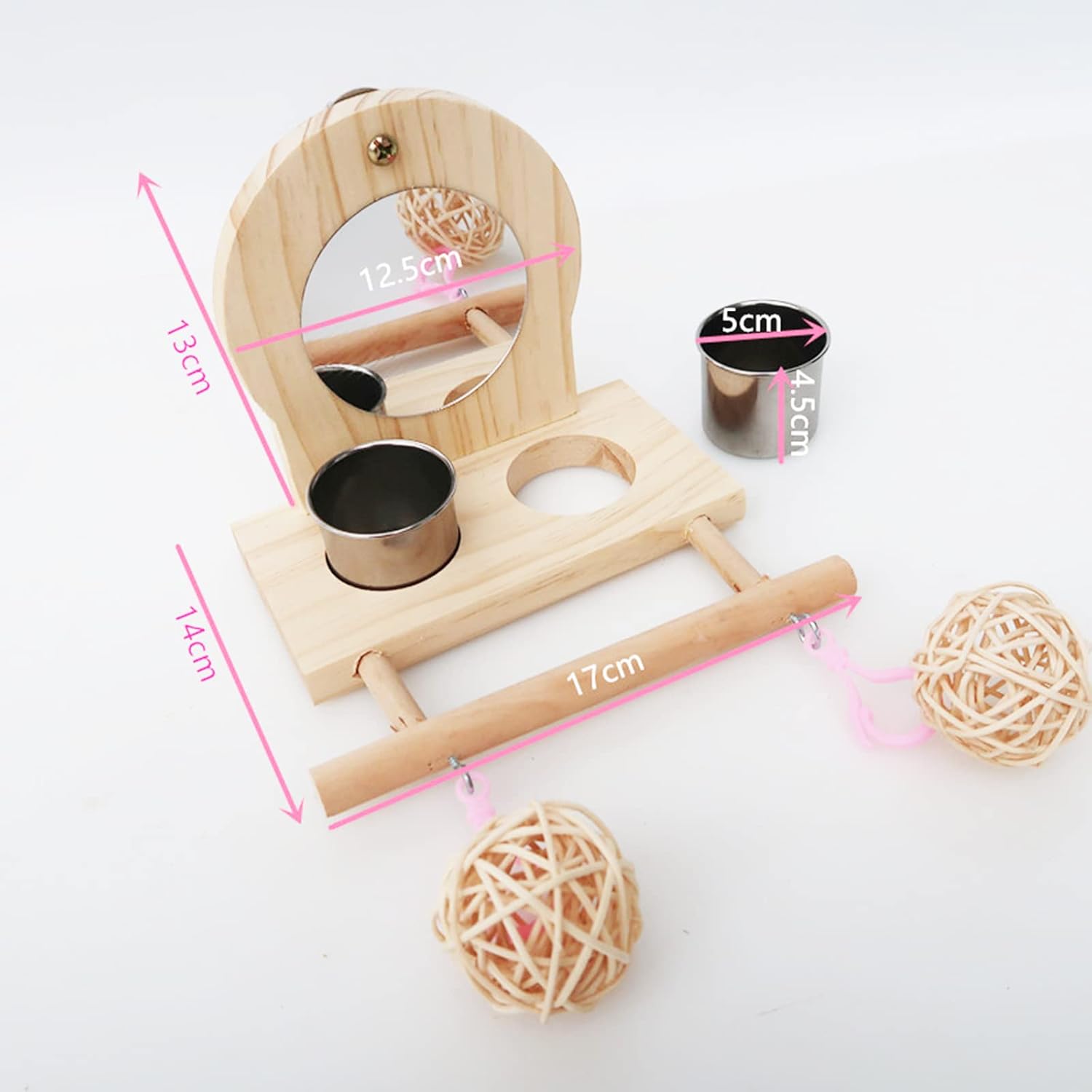 - 【WHAT YOU GET】Our bird mirror toys set includes 1 round mirror, 2 bird ball toys, 1 wooden bird platform perch for cage and 2 bird feeding cups. This versatile design not only meets the daily play needs of pet birds, but also enhancing her curiosity, exercising her enthusiasm.