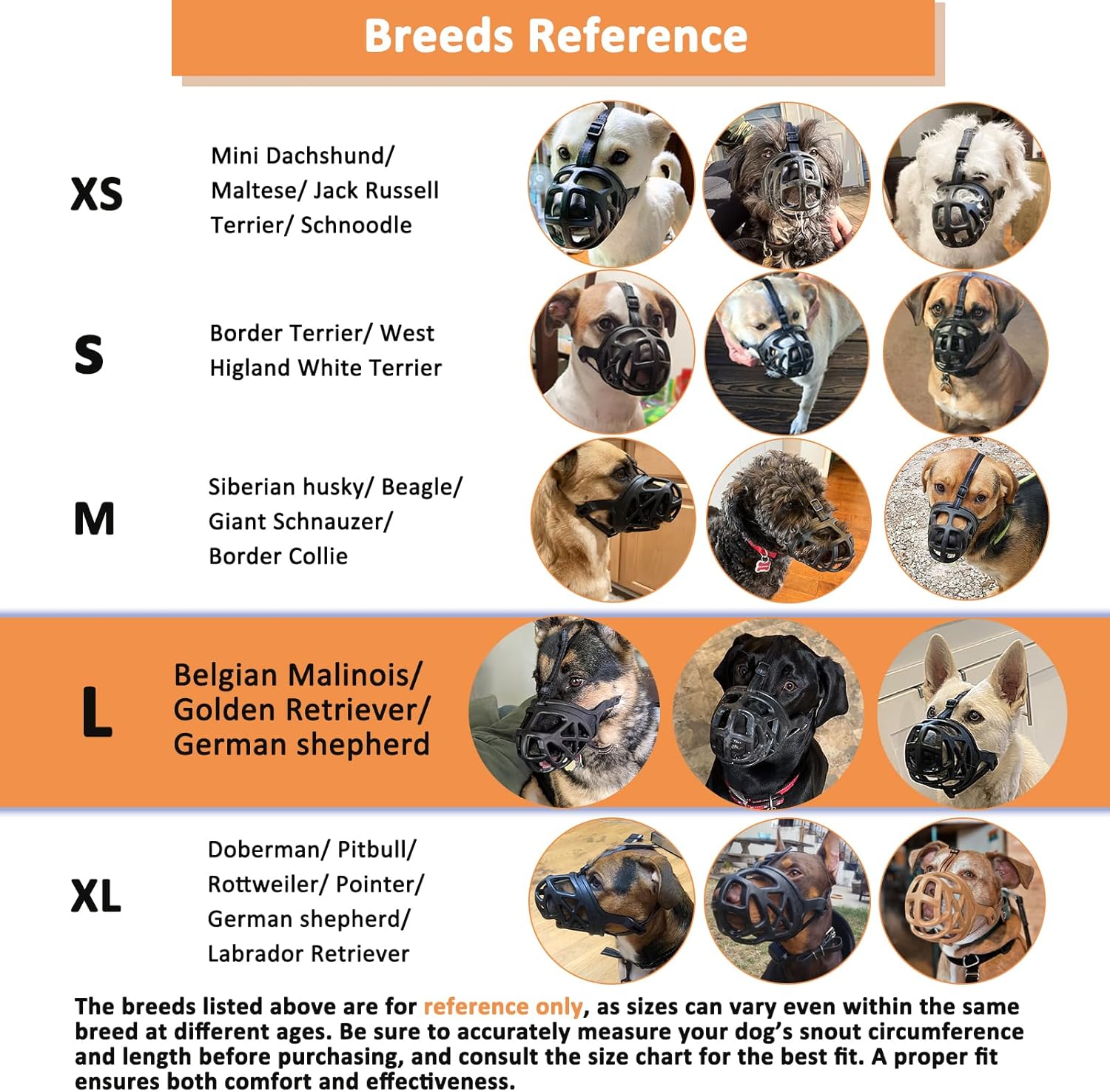 - Perfect Fit for Large Dogs: This option Size L large dog muzzle is ideal for large breeds like Golden Retrievers, German Shepherds. The breeds listed above are for REFERENCE only. Be sure to measure your dogβs snout circumference and length accurately before purchasing, and refer to the size chart. A proper fit ensures comfort and effectiveness