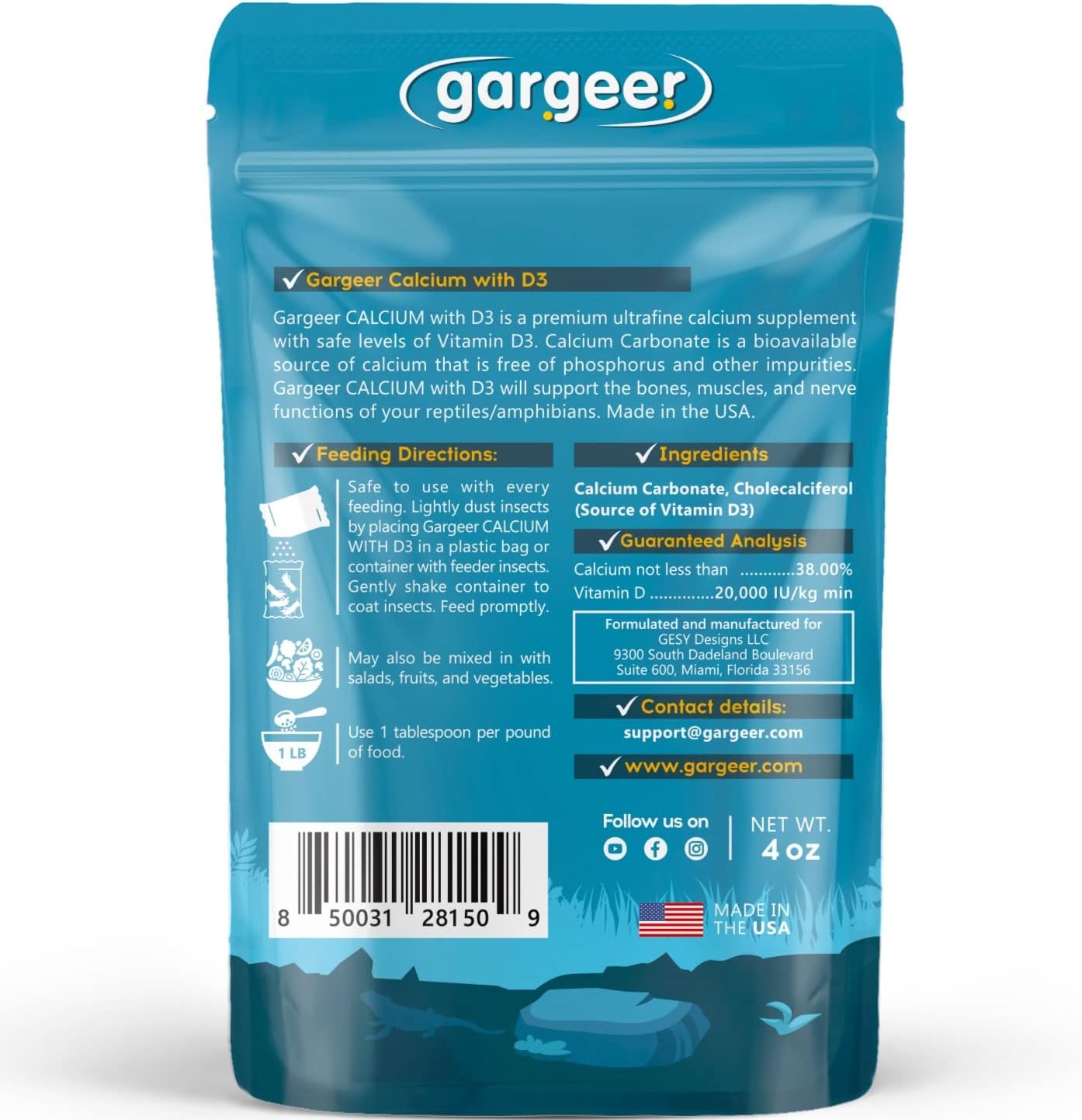 - STICK WITH US. Gargeer’s ultrafine calcium particles stick better to feeder insects and mix well into salads. DO NOT ADD DIRECTLY INTO WATER.