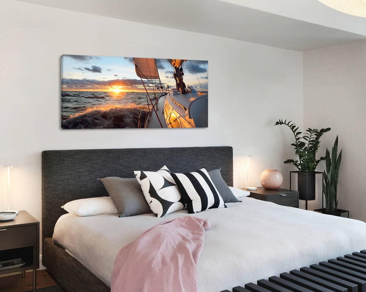 Yacht Sailing in Sea at Sunset Scenery Canvas Wall Art for Living Room Bathroom,Close-up View of Deck Mast Sails Picture Print Artwork Painting Decor,Epic Seascape Scenic Landscape,Inner Frame 24x48