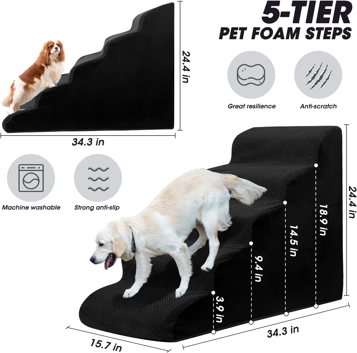 - LARGER SIZE & BRING MORE COMFORT: Each step is extra large with surfaces are 15.75 inches x 7.9 inches. Our dog stairs are very suitable for elderly dogs/cats who have difficulty for moving. The wider and deeper steps help reduce constantly jumping on the bed, sofa or car, and our dog steps will not shake and slip as long as you wait the foam expand to its shape.. The cover is durable and anti-scratch and pets will not wobble on the stairs