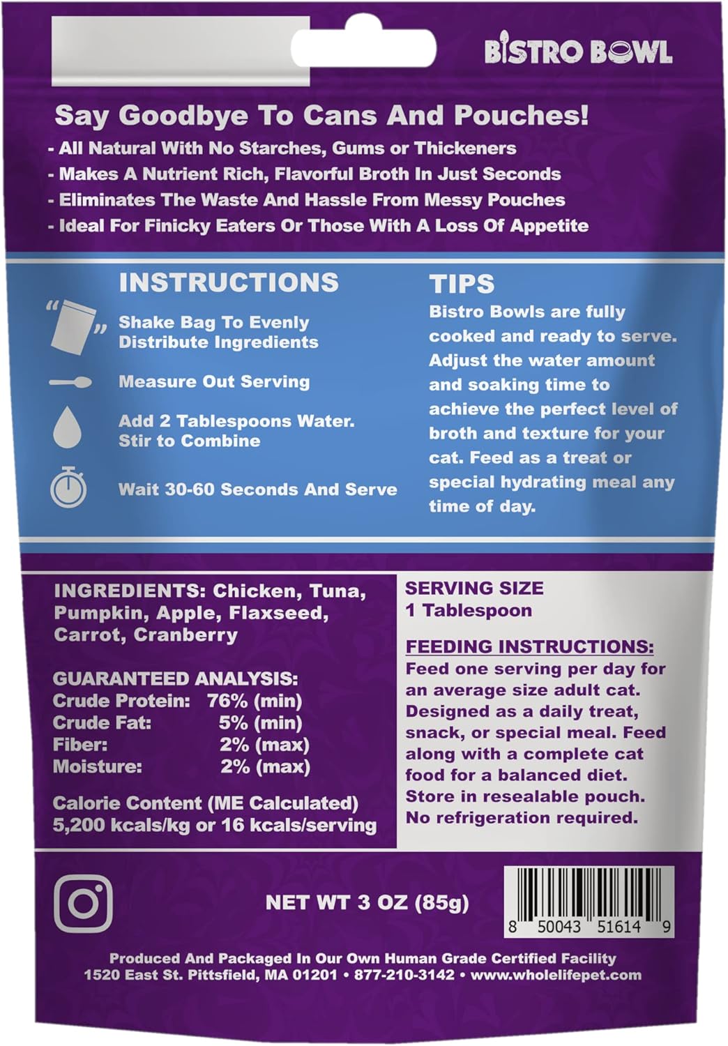 Whole Life Pet Bistro Bowls - Human-Grade Wet Food Toppers & Complement, Natural & Flavorful Broth, Instantly Hydrating Cat Snacks, Lickable Cat Treats, Just Add Water - Chicken & Tuna, 3 Oz