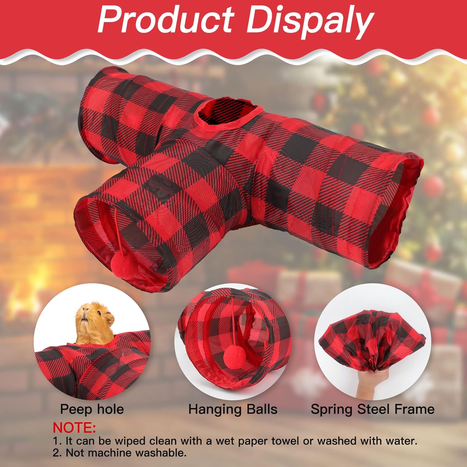 - 🐹【Special Design of Guinea Pig Tubes】Classic plaid pattern, fashionable and timeless. The peephole design of the guinea pig hide aways allows you to very closely observe your pets playing in it. In addition, we can also use interactive toys to interact with small pets through the peephole in the middle. There is also a hanging ball added to the front exit to add to the fun of playing.