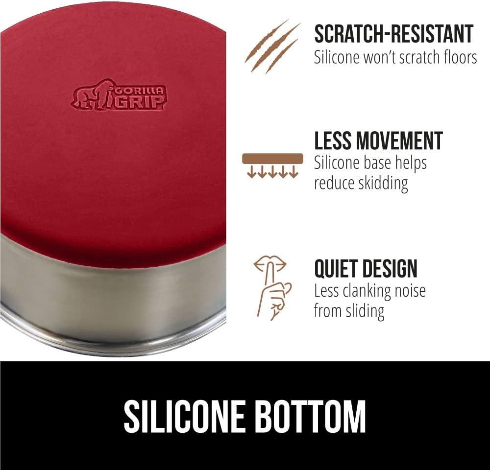 - SILICONE BOTTOM: the Gorilla Grip bowl is constructed from durable silicone that helps keep the bowl steady and wonβt scratch your floors; while some over eager eaters may still be able to slide the bowls, the silicone will help prevent much movement; plus, it reduces the noise from clanking and sliding across wood, tile, and more