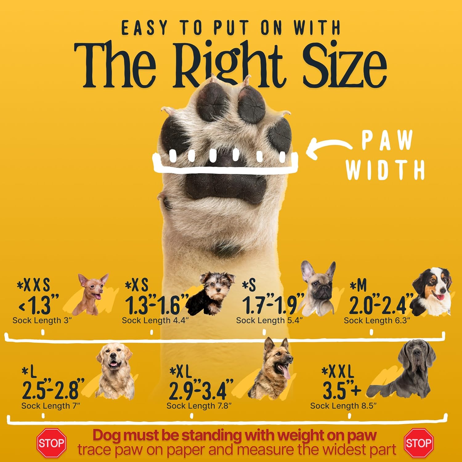 - Small fits paws 1.7" - 1.9". Measure while dog is standing with weight on paw. Includes 4 dog grip socks. Snug fit is normal—extra grip makes them stiffer than other socks but provides better traction