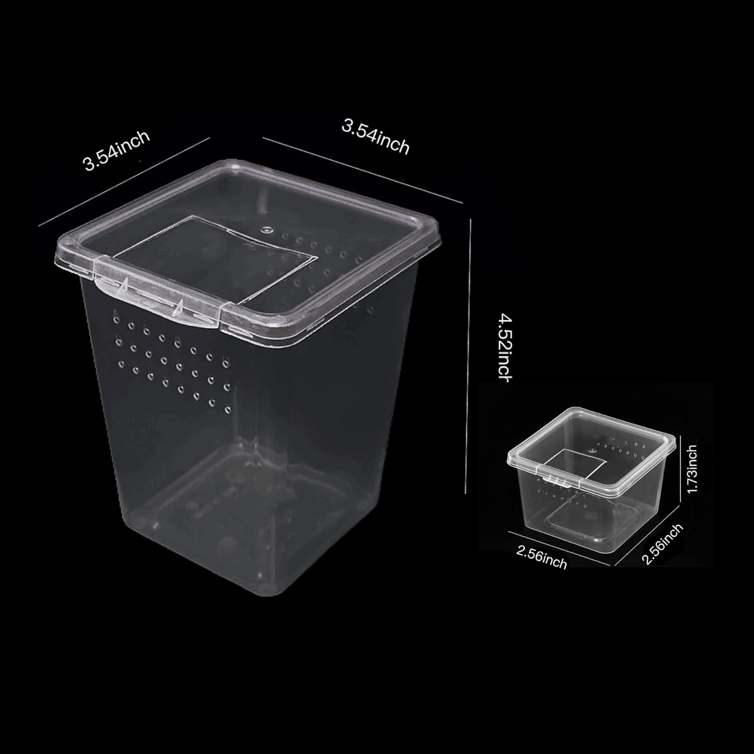 - γinsect Box Setγ: package include 4 pcs high insect terrarium and 4 pcs small breeding box ,high box measure about 3.54"L x 3.54"W x 4.52"H, small box measure about 2.56"L x 2.56"W x 1.73"HοΌMade of quality plastic material, good transparency, sturdy , reusable, easy to clean, easy to clean, lightweight and light, suitable for pet incubation, small pet breeding box, temporary feeding or outdoor transportation and carry.