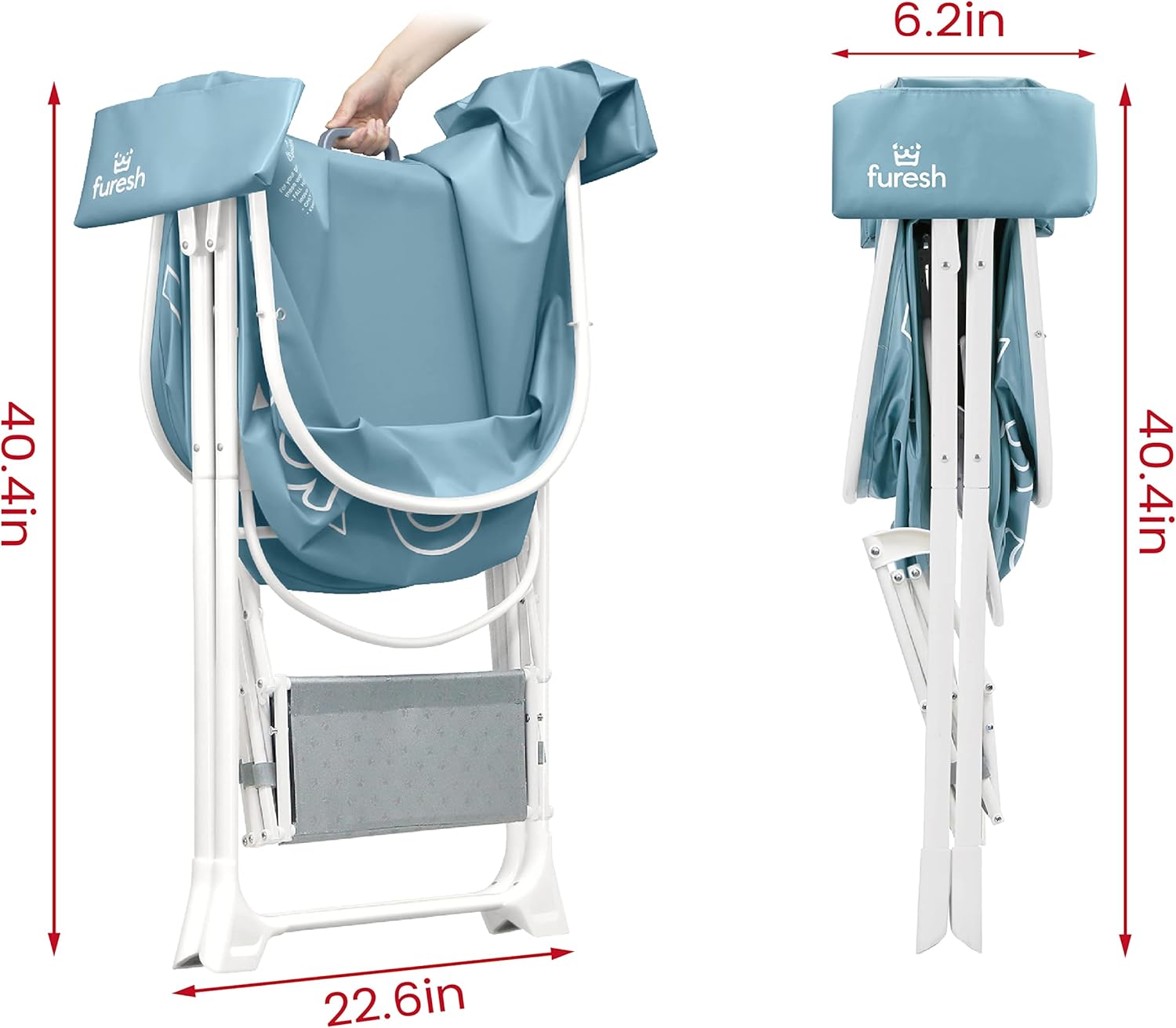 - γFOLD IN SECONDSγThanks to lightweight construction and patented folding mechanism, the tub can fold and deploy with one hand in seconds.All patents and copyright reserved. Pull the handle in the middle to fold it from 46.1" to 6.2" wide for easy storage. The tub's legs and stairs are removable to save more space in storage and transit
