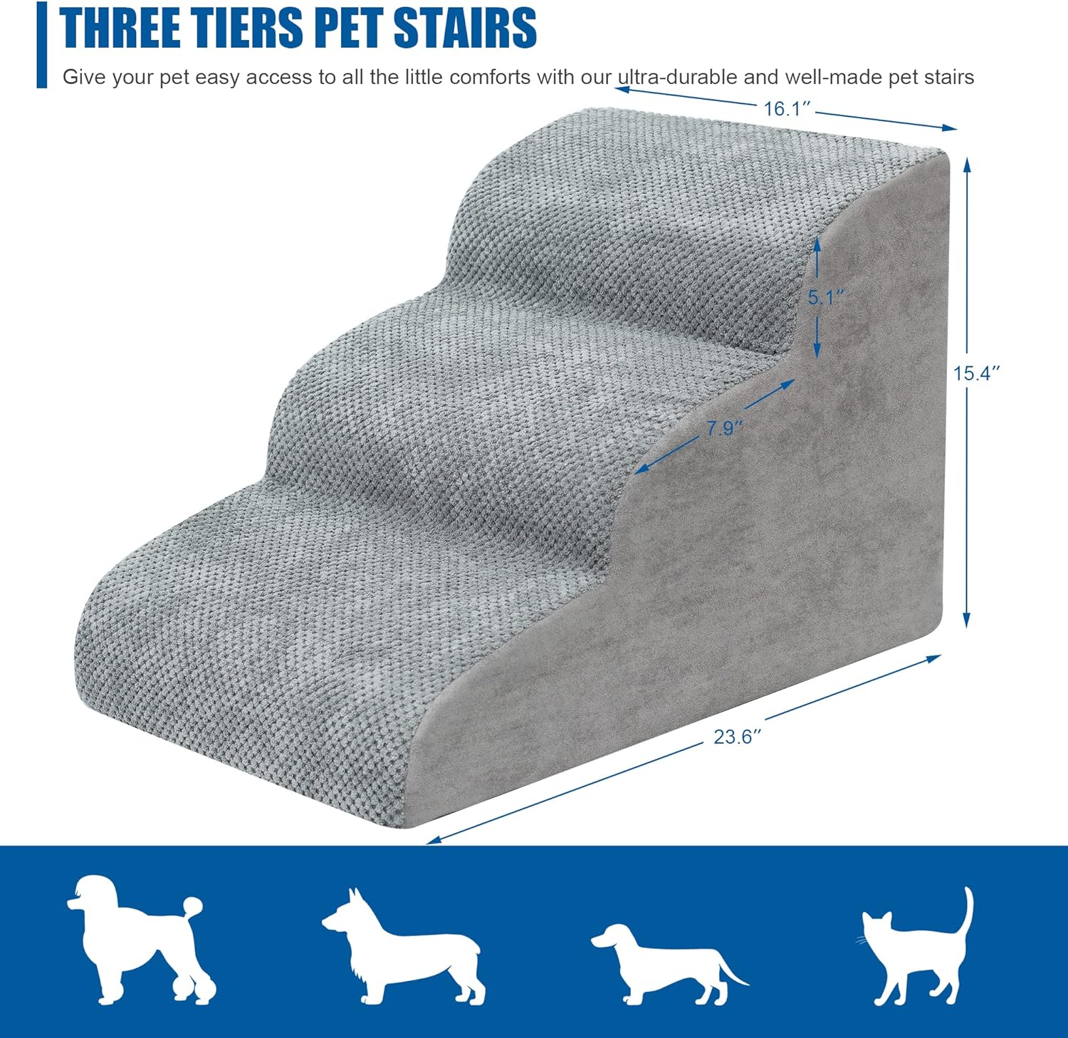 Dog Stairs for Small Dogs - High Density Foam Dog Ramp, Extra Wide Pet Steps with Non-Slip Bottom for High Beds, Couche and Sofa, Best for Dogs Injured, Older Doggy Cats (Grey, 3 Steps)