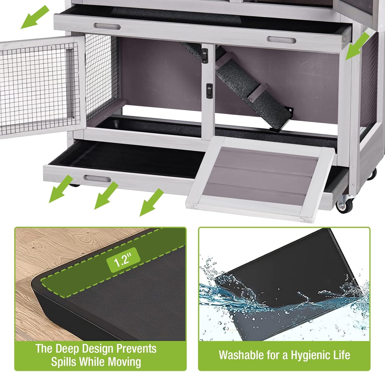 - Rabbit hutch with TWO DEEPER pull out tray that wonβt leak off and easy-to-clean