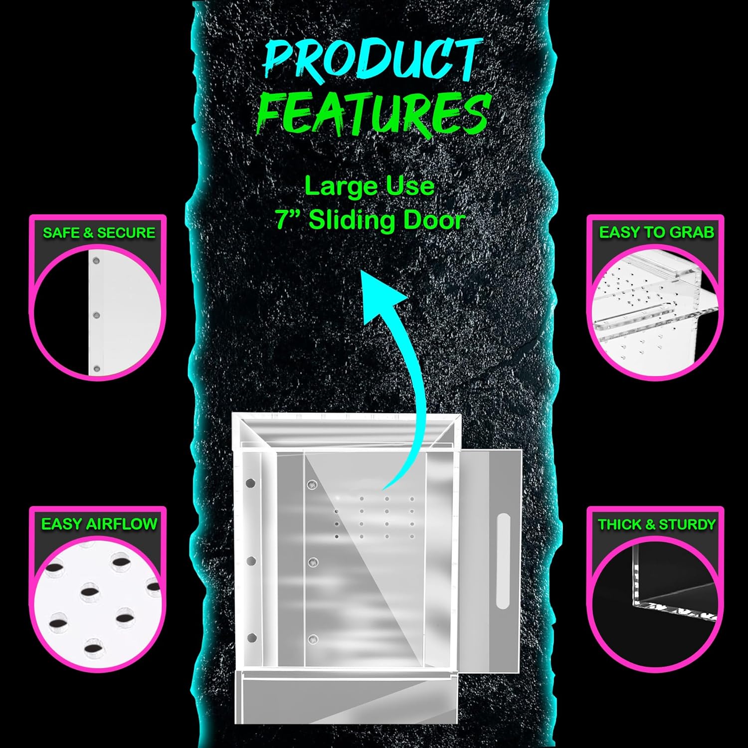 - Acrylic Reptile Enclosure: Our terrariums are a crystal clear acrylic box made for 360 degree viewing, offering 5mm thick acrylic walls, making them sturdy. These reptile tanks come equipped with a 7” sliding magnetic door and a 3” handle for easy handling along with 3mm holes for ventilation and air circulation.