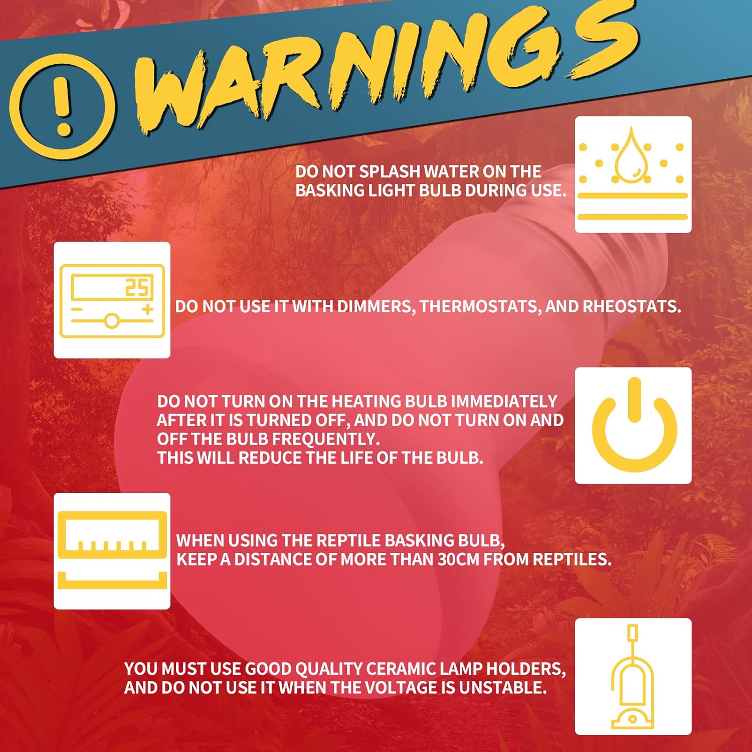 - 🦎Safety Instructions - You must use good quality ceramic lamp holders, and do not use it when the voltage is unstable. Do not use it with dimmers, thermostats, and rheostats. Do not splash water on the basking light bulb during use. When using the reptile basking bulb, keep a distance of more than 30cm from reptiles. Do not turn on the heat bulb immediately after turning it off, and do not turn the bulb on and off frequently.