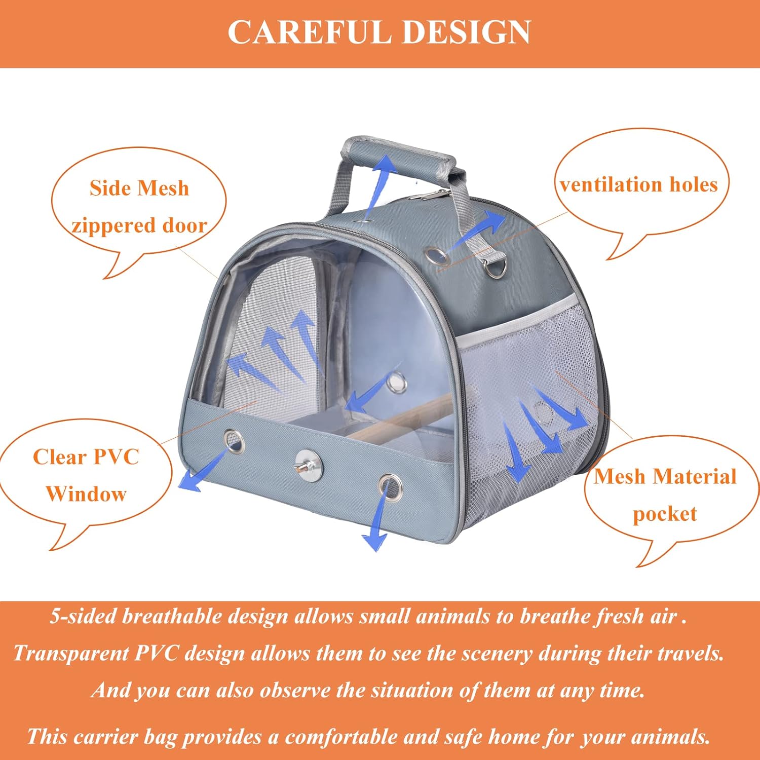 - 1.Big Transparent Window: There is a large transparent window made of PVC in the front of the bird carrier bag. This clear window allows small pets to see the scenery outside during their travels, and you can keep an eye on your pets at all times