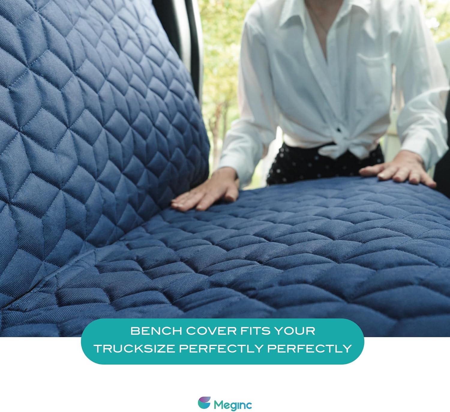 - πγSTURDY MATERIALγ: HEAVYDUTY! HEAVYDUTY! HEAVYDUTYοΌMeginc bench seat covers is made of 600D Oxford cloth, 100g soft PP cotton, 210D polyester fabric, 100% waterproof TPU and PVC anti-slip mesh. A thick pet seat cover can mitigate the damage of your vehicle and protect carpet, upholstery from unpleasantries such as dog hair, urine, or vomit, moreover our protectors also providing a familiar, comfortable and safety space for your pets during the road travel.