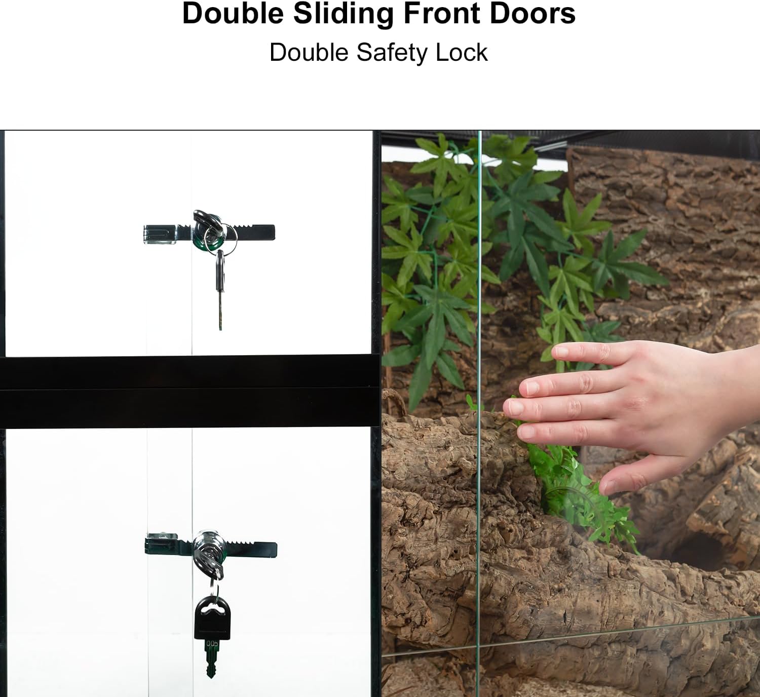 - γDouble Front Sliding DoorγAdopt new patent design to be top grade small animal and reptile terrarium. In order to manage the tall reptile tank more conveniently, this bearded dragon terrarium has two upper and lower sliding doors. It's easy to clean the tank or add decoration. Safety lock prevents unwanted opening from children or pets.
