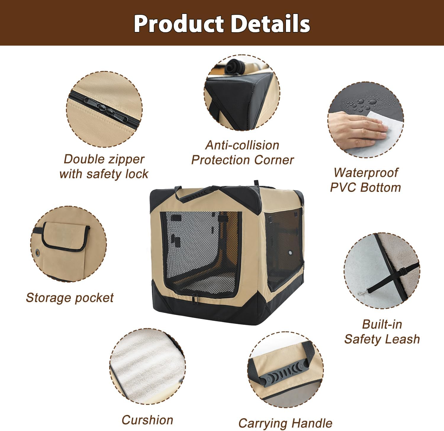 - Stable Structure: The foldable crate is made with a sturdy steel frame and high-quality waterproof Oxford fabric, ensuring that your pet is safe and secure while inside. The mesh windows allow for ventilation, while the zippered door makes it easy to access your pet.