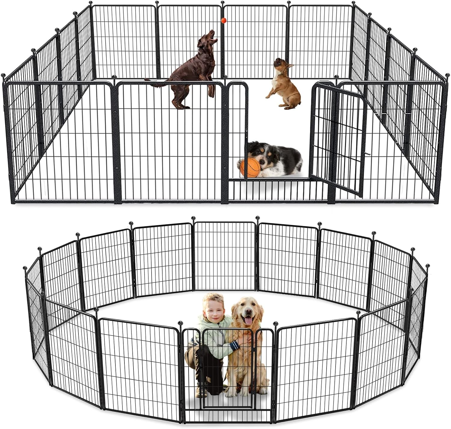 - 【Safe & Sturdy Upgraded Design】: Our puppy pen features an upgraded automatic door lock, easy to lock and unlock, prevents pets from escaping at the same time. The metal rods are designed with round ball tops for protecting you and pet claws. The improved stakes are robust and simple to insert into the ground for increased sturdy and stability
