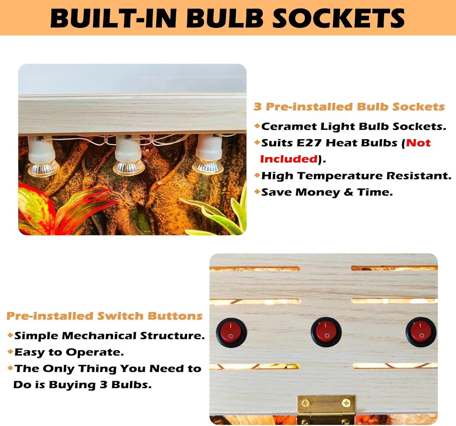 - γBuilt-in Bulb SocketsγFeaturing two built-in bulb sockets (three in the 40&48-inch version) compatible with E27 heat bulbs, night lights, and more (bulbs not included). Easily set up your lighting for the perfect reptile habitat.
