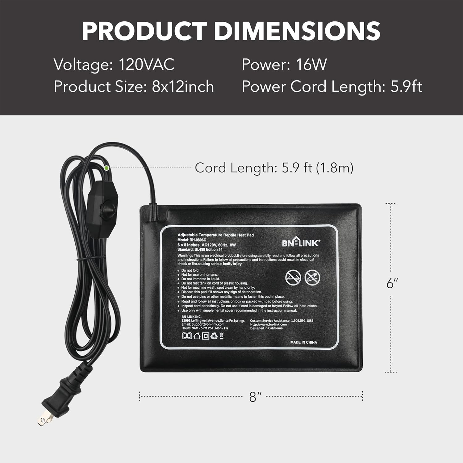 - MADE FOR REPTILES: Voltage: 120 volt, Power: 8 watt. The 6" x 8" with adjustable knob model is perfect for a 10 -20 gallon terrarium and it can easily put out steady heat between 104β and 122β. Each unit comes with BN-LINKβs strong 15-month warranty.