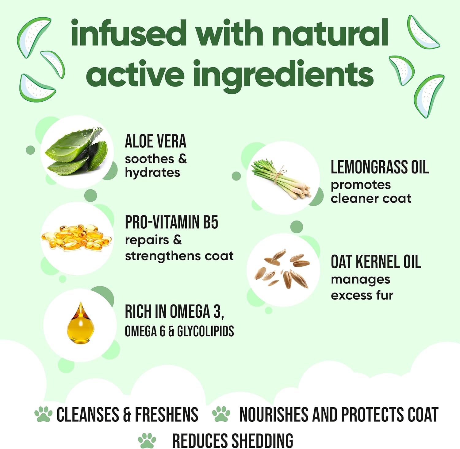 - Product Benefits : Helps minimize shedding, promotes healthy skin, and nourishes the coat with a blend of omega 3 & 6, glycolipids, aloe vera, lemongrass, and pro-vitamin B5. Helps minimize shedding, promotes healthy skin, and nourishes the coat with a blend of omega 3 & 6, glycolipids, aloe vera, lemongrass, and pro-vi⦠See more