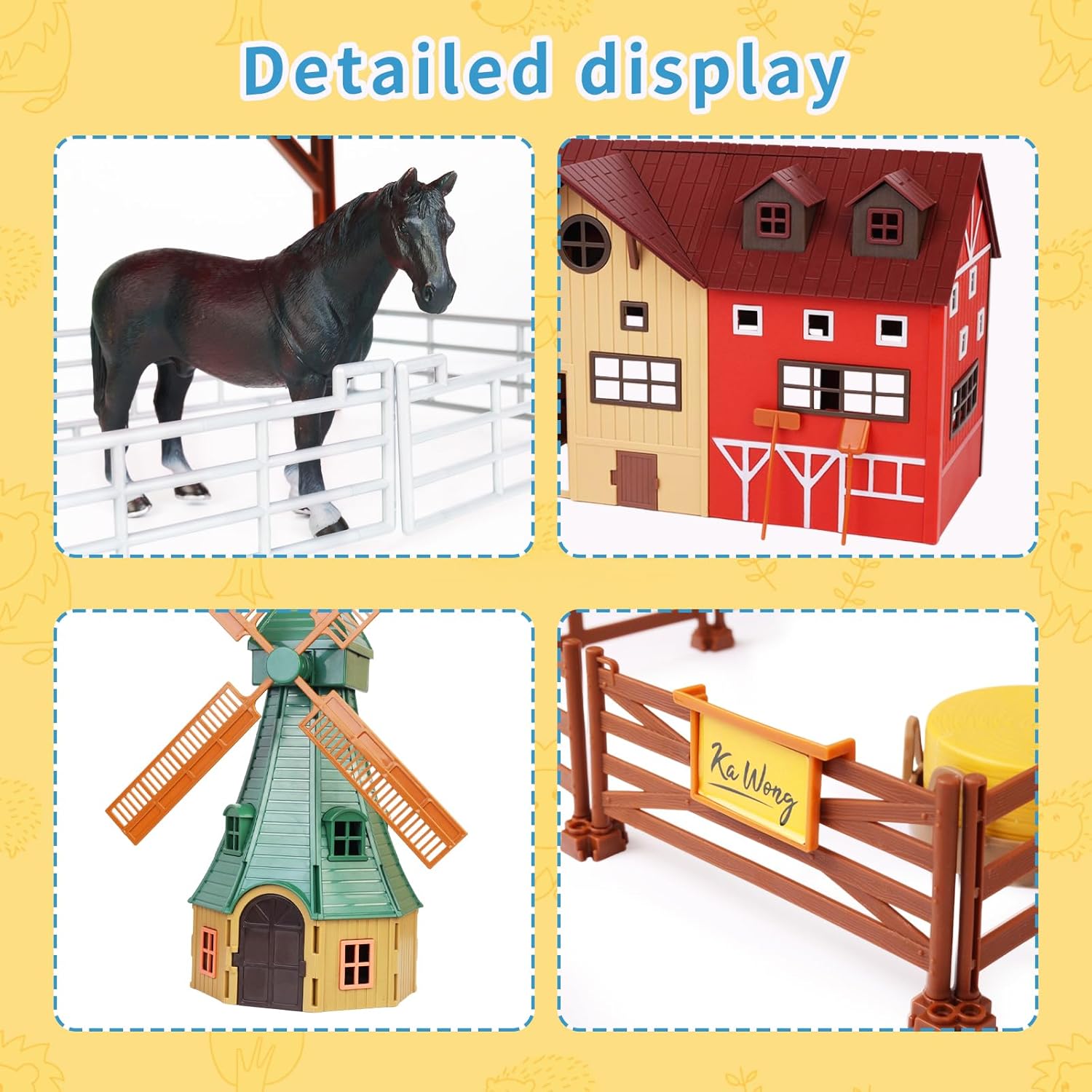 - Endless Farm Fun:Delight your little ones with this 140-piece Farm Animals Figurines Toy Set! Let their imaginations run wild as they create their own farm scenes with the barn, horse stable, tractor trailer, windmill, farmer, fence, and farm tools included in this playset.