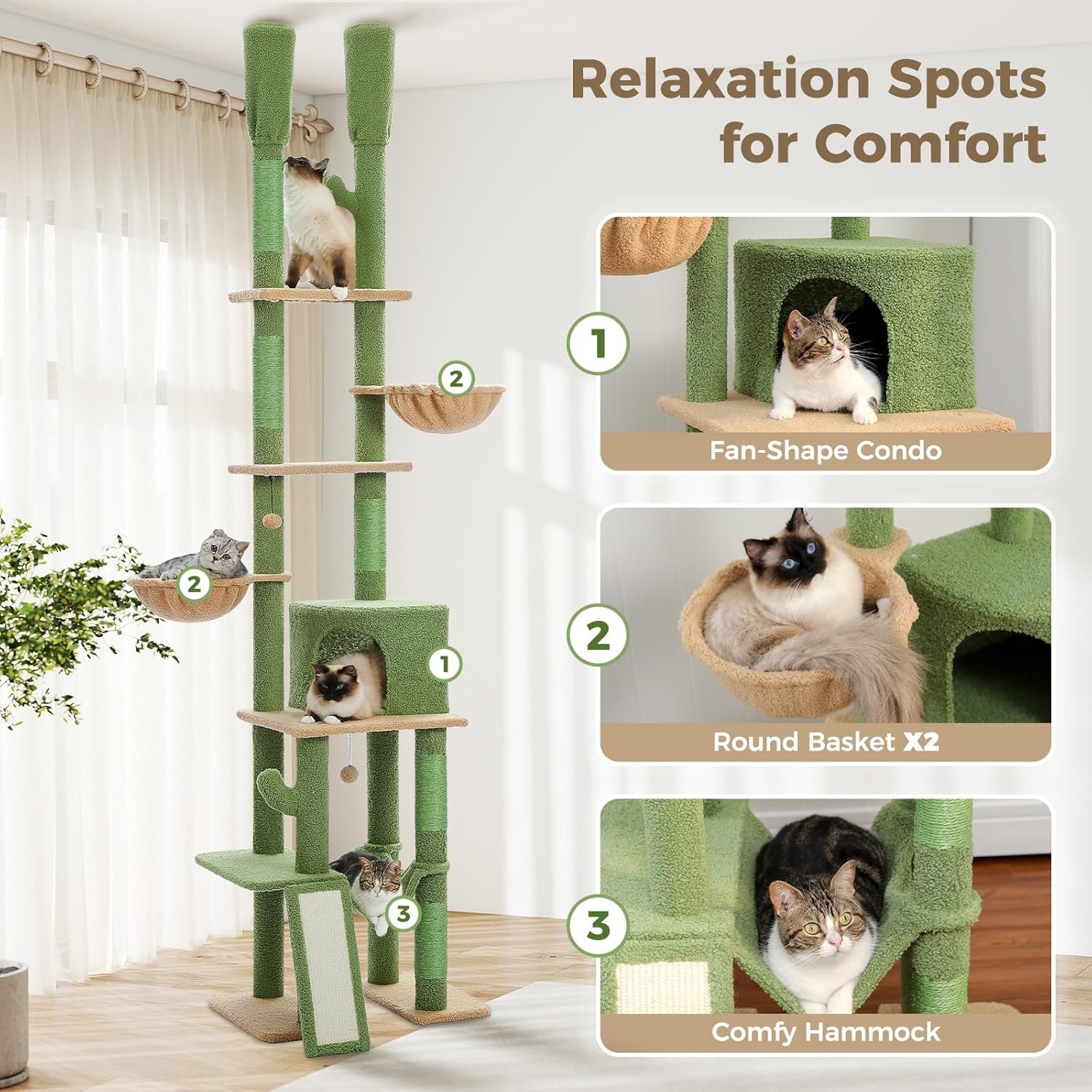 PAWZ Road Cactus Cat Tree Floor to Ceiling Cat Tower with Adjustable Height(85-112 Inches), 7 Tiers Climbing Activity Center with Cozy Hammocks, 5 Platforms and Scratching Posts for Indoor Cats