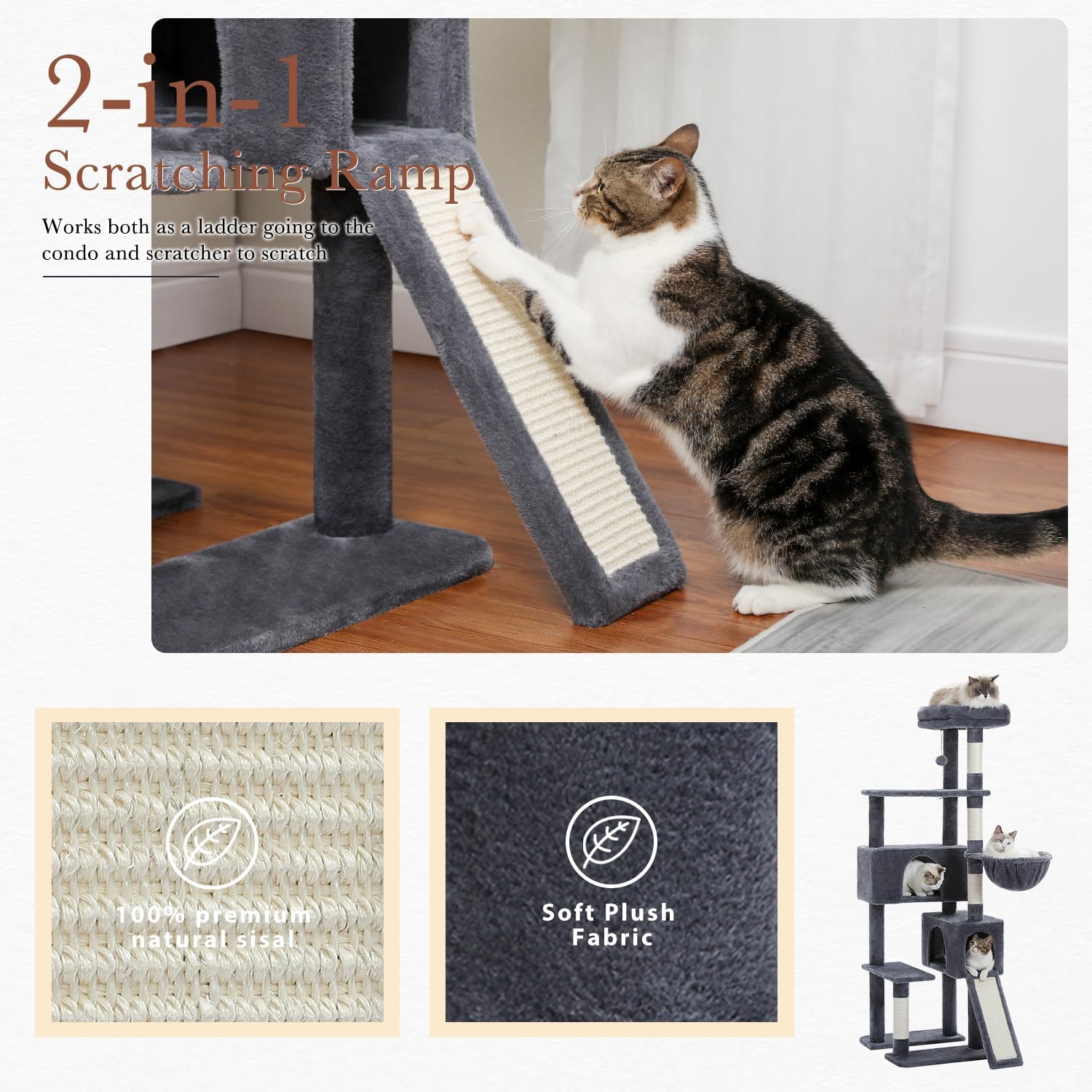 - Durable and Strong: The needs of scratching can be fully satisfied! 100% natural sisal covered posts for fufiling your furriesβ scratching nature. And the 2-in-1 ramp works both as a ladder going to the condo and a scratching board to fully scratch, not only maintains your furriesβ nail health, but also saves your furniture from daily scratching.